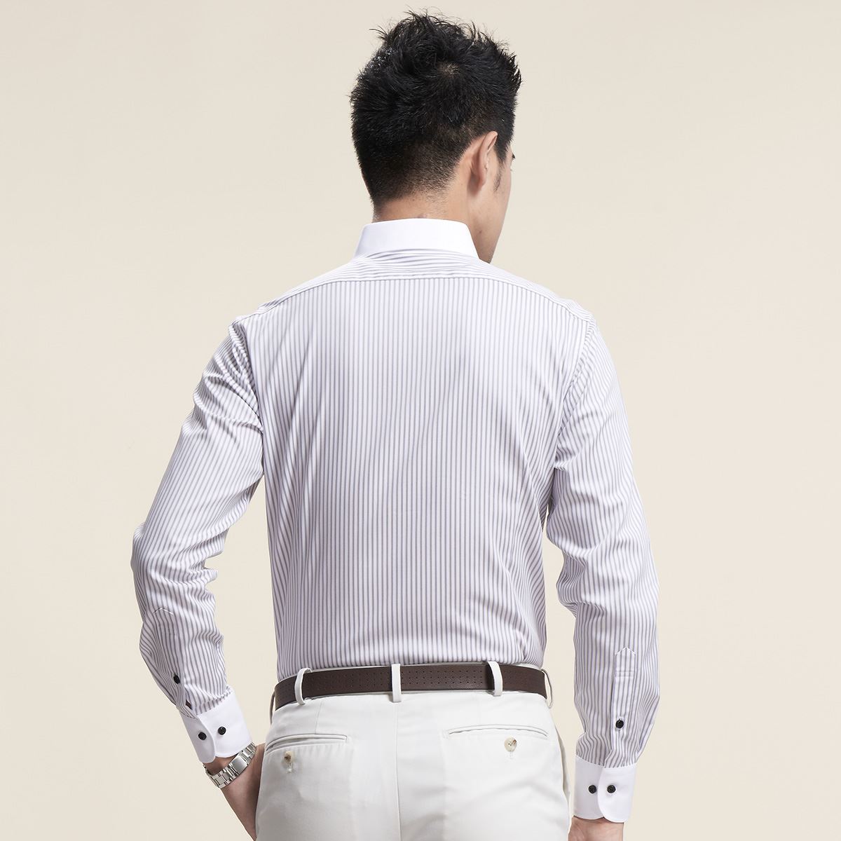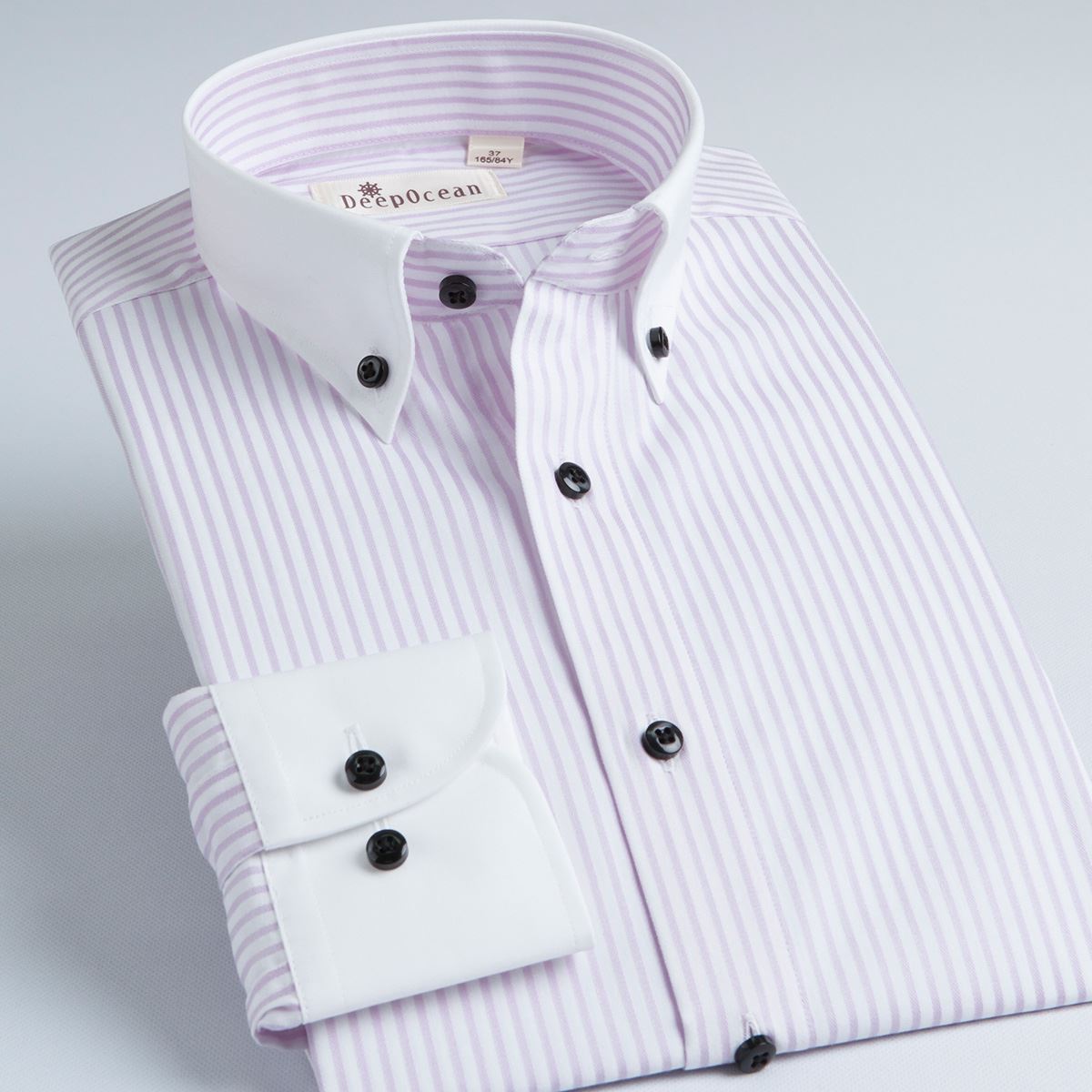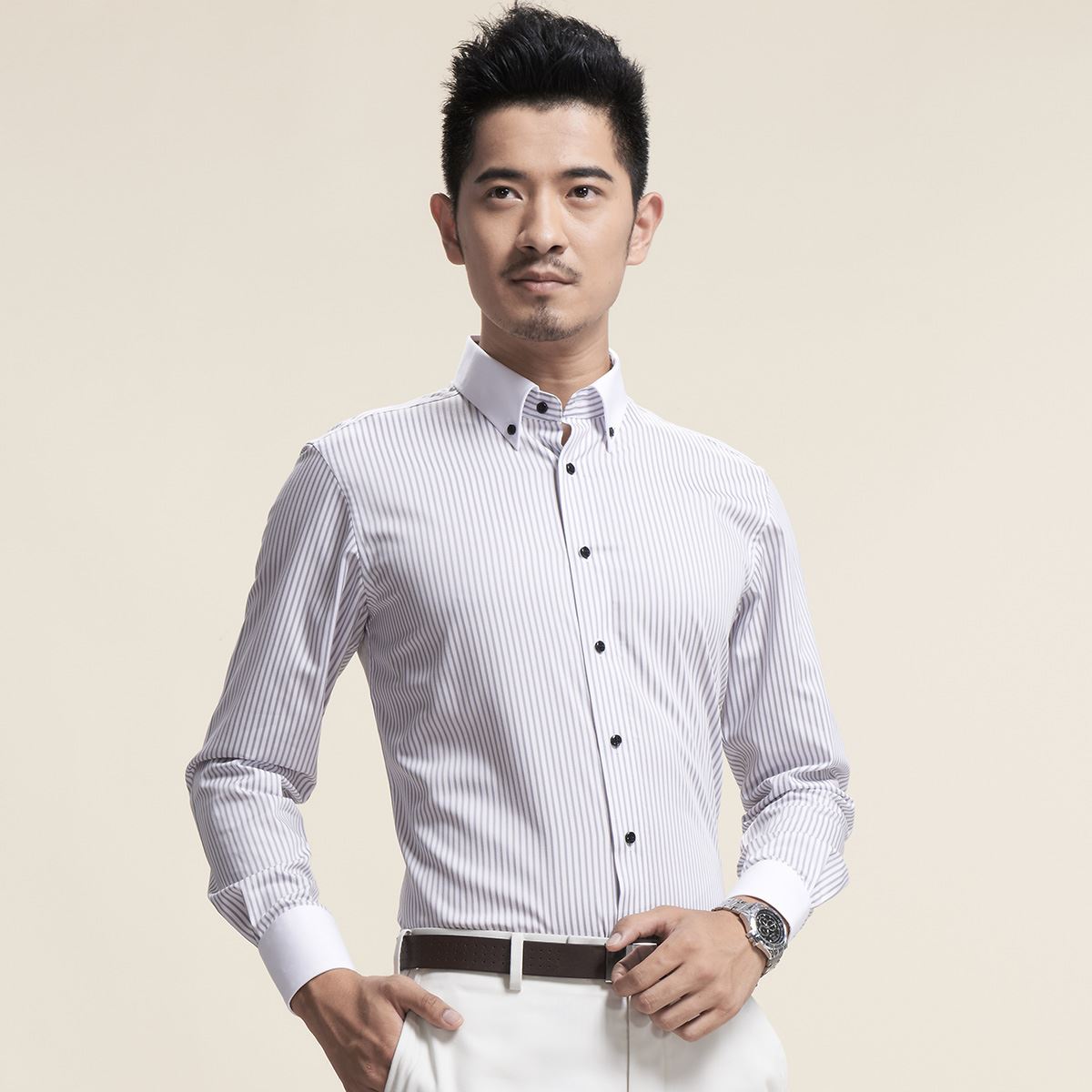 / 襯衫長袖修身男士藍灰粉色商務細條紋純棉修身秋秋釘扣領男裝襯衣