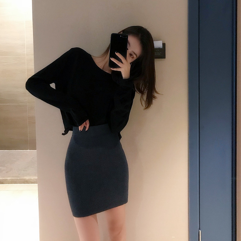 黑色針織衫|灰色半身裙