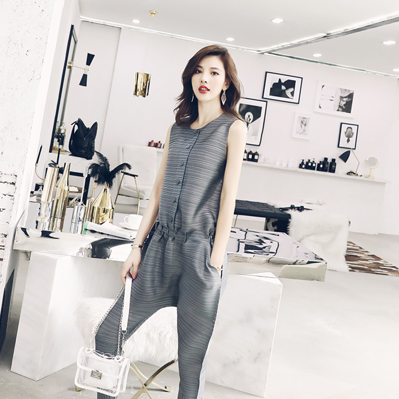 / 2018夏裝韓版新款歐美時尚休閑無袖上衣松緊收腰哈倫九分連體褲女