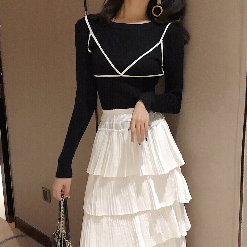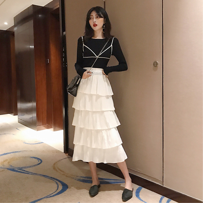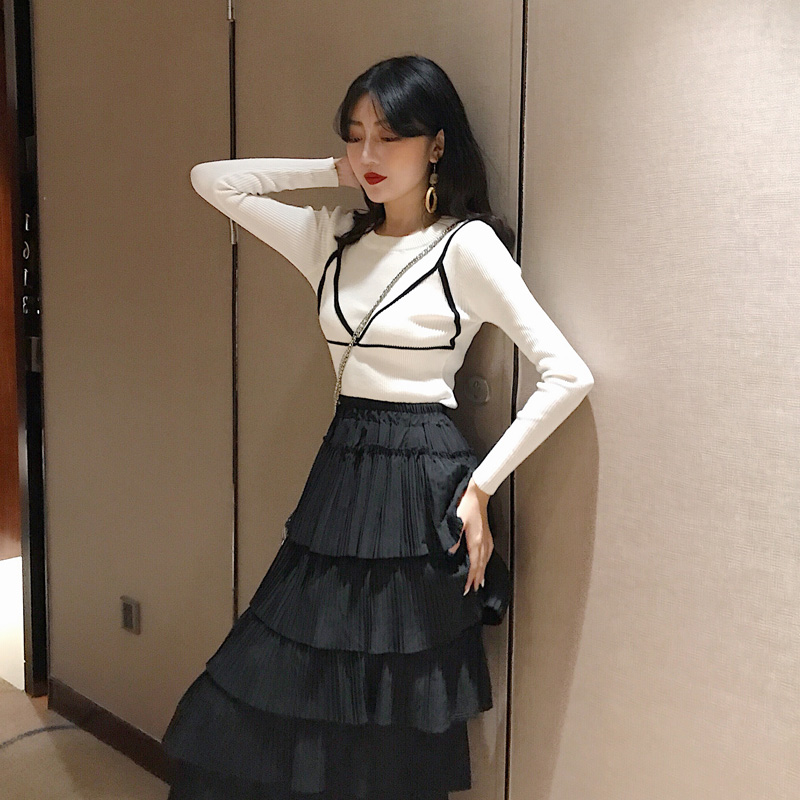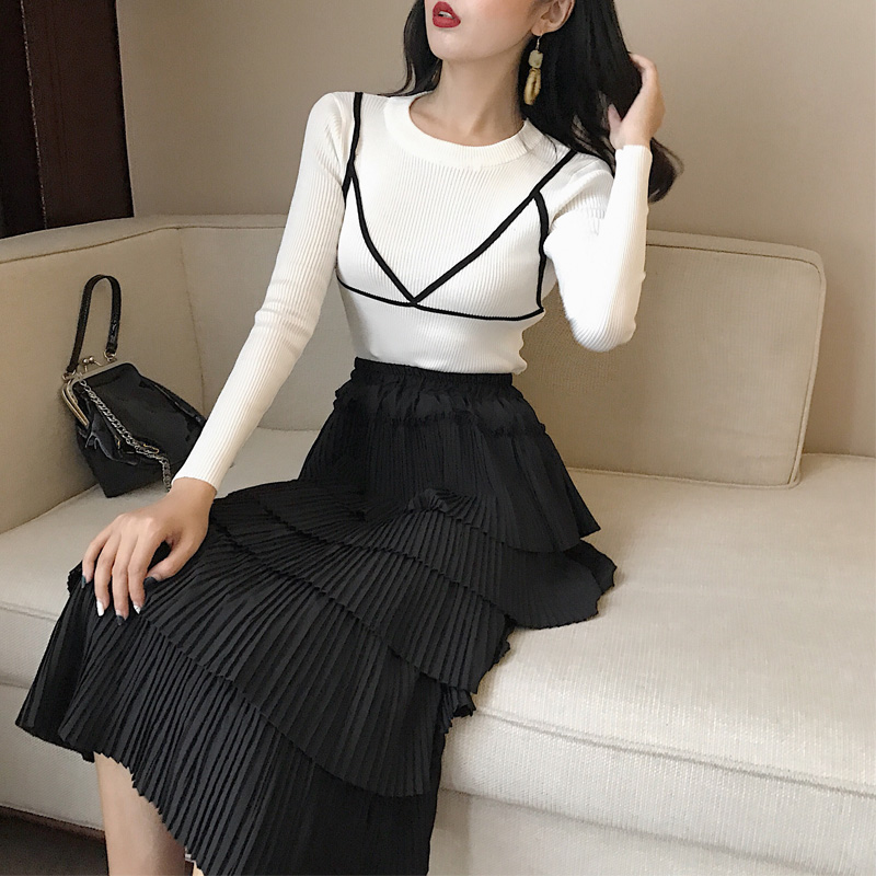 / 2018新款秋季時尚修身顯瘦針織衫百褶裙套裝女中長款蛋糕裙兩件套