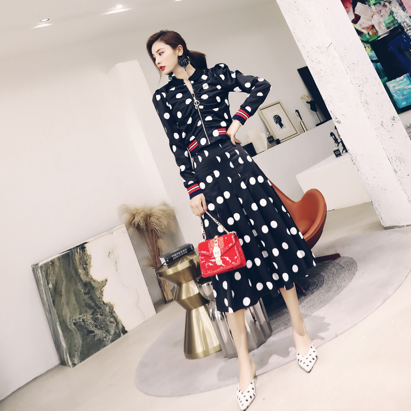 / 歐洲站2018秋裝新款氣質套裝波點休閑長袖上衣中長款半身裙兩件套