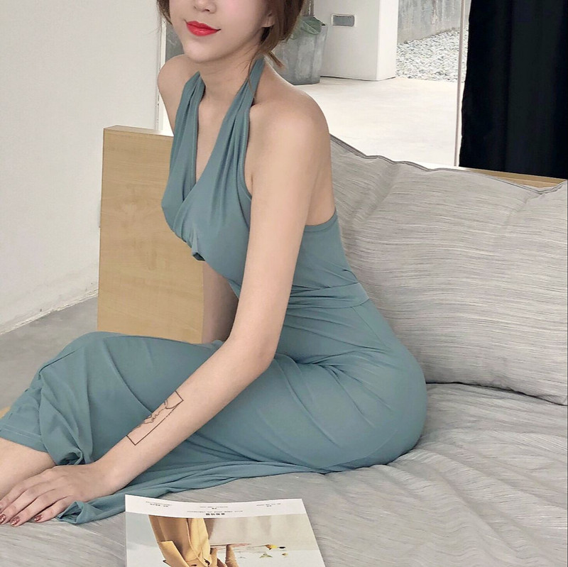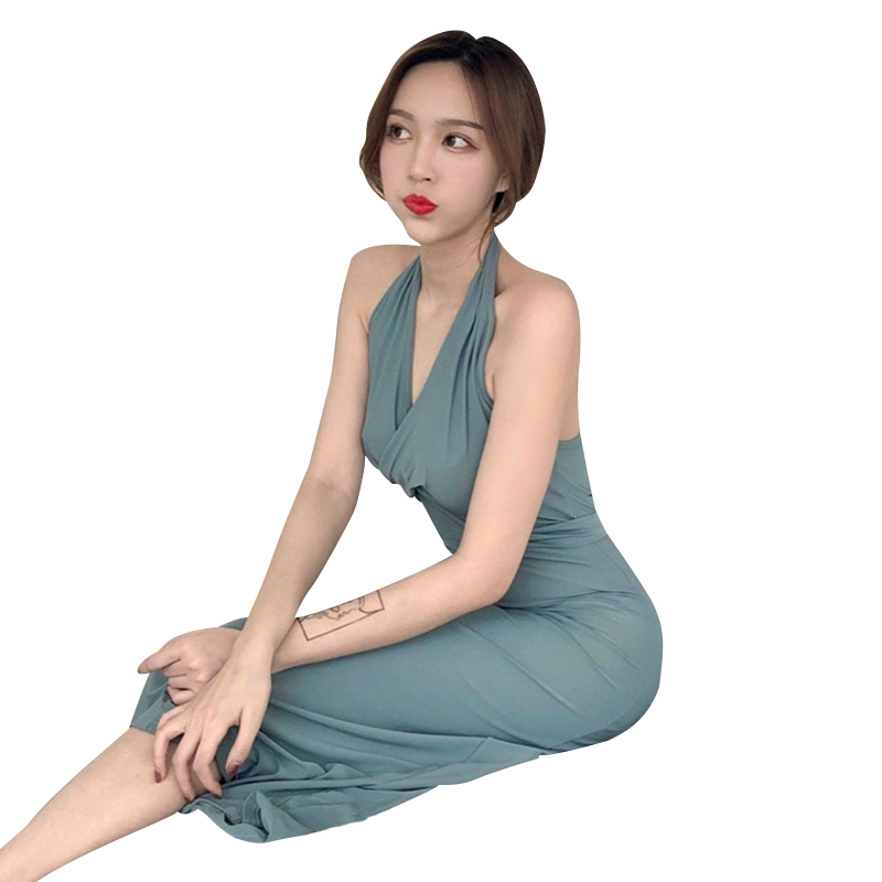 / 港味新款韓版藍灰色掛脖高腰綁帶復古簡約晚禮服修身顯瘦連衣裙女