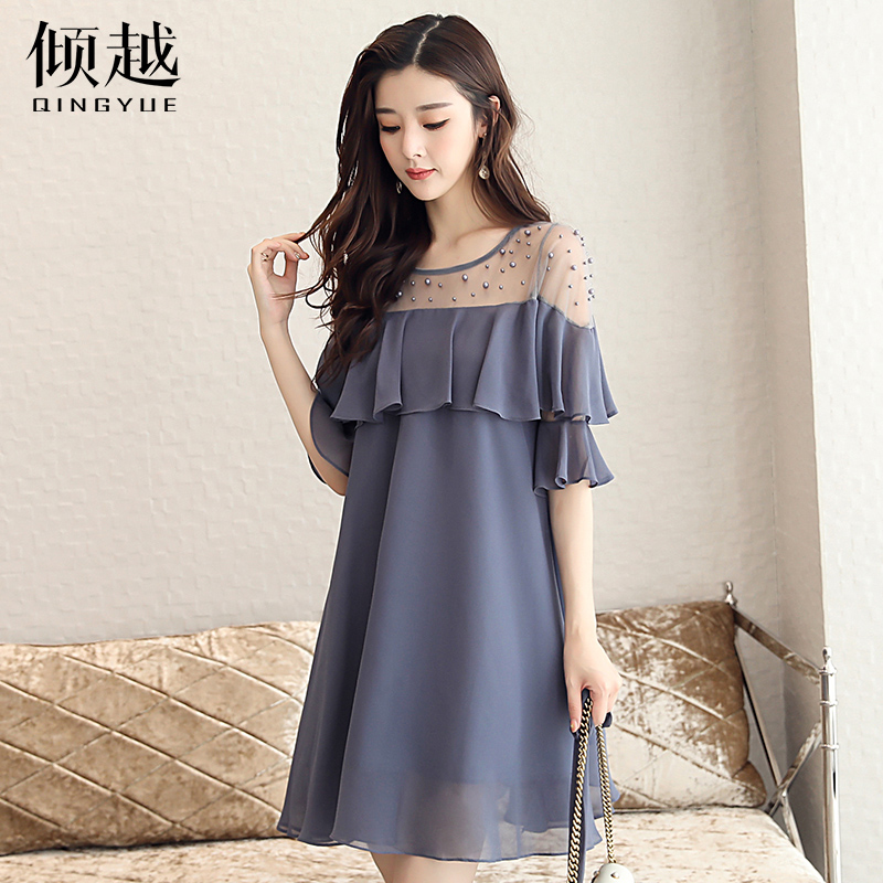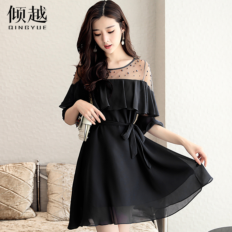2017夏季新款甜美圓領短袖a字裙顯瘦修身氣質網紗拼接純色連衣裙