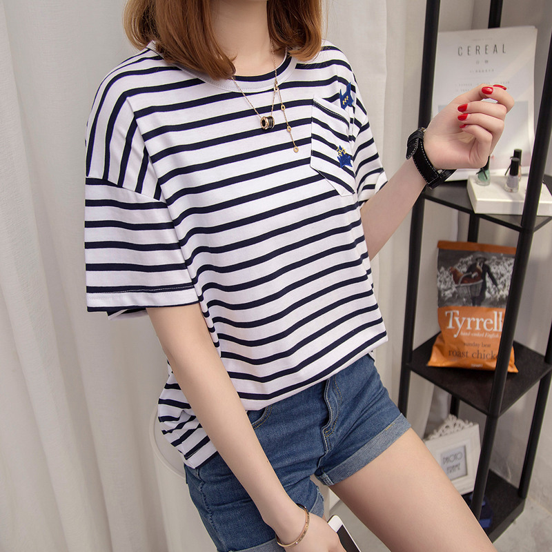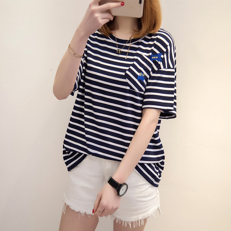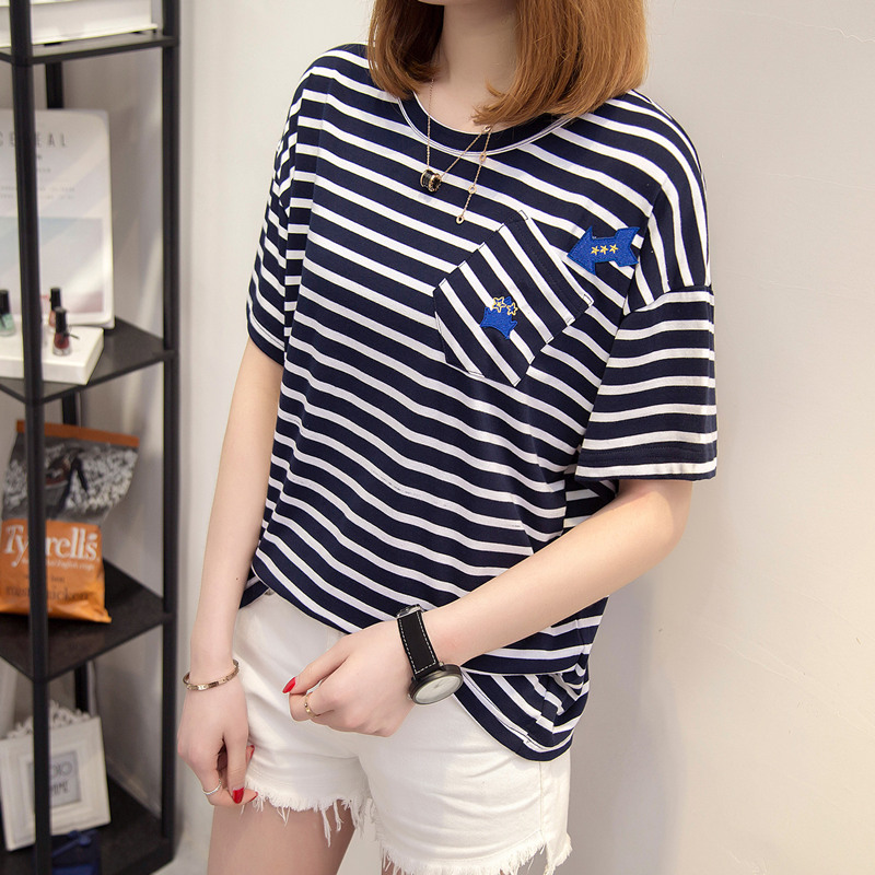 夏裝新款條紋t恤女韓版百搭上衣女夏圓領寬松條紋貼布體恤衫