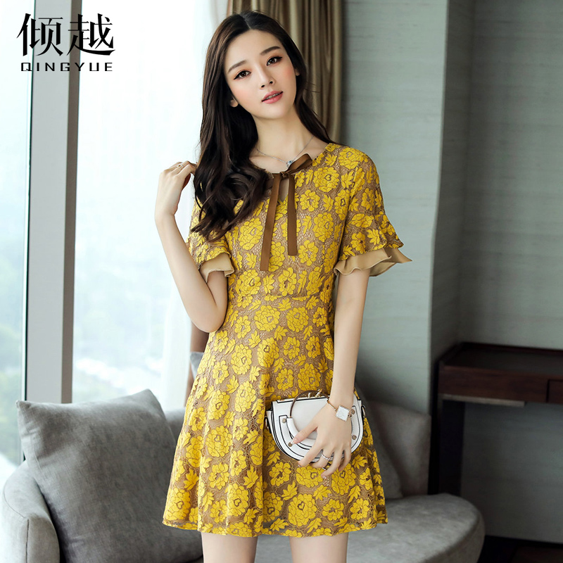 / 2017夏新款女雪紡碎花中長款連衣裙優雅氣質喇叭袖蝴蝶結印花裙子