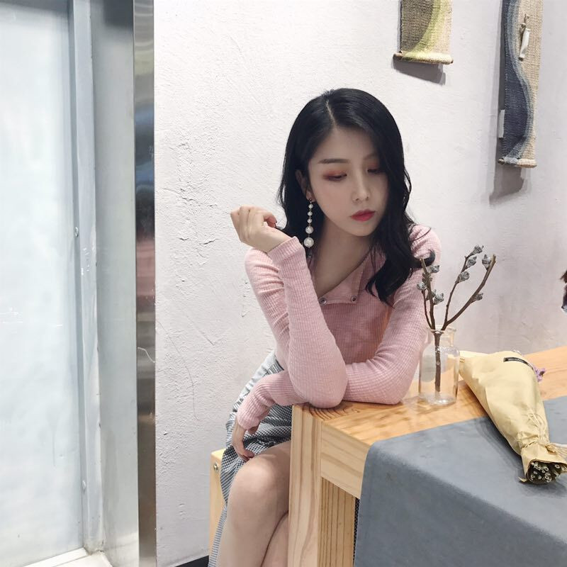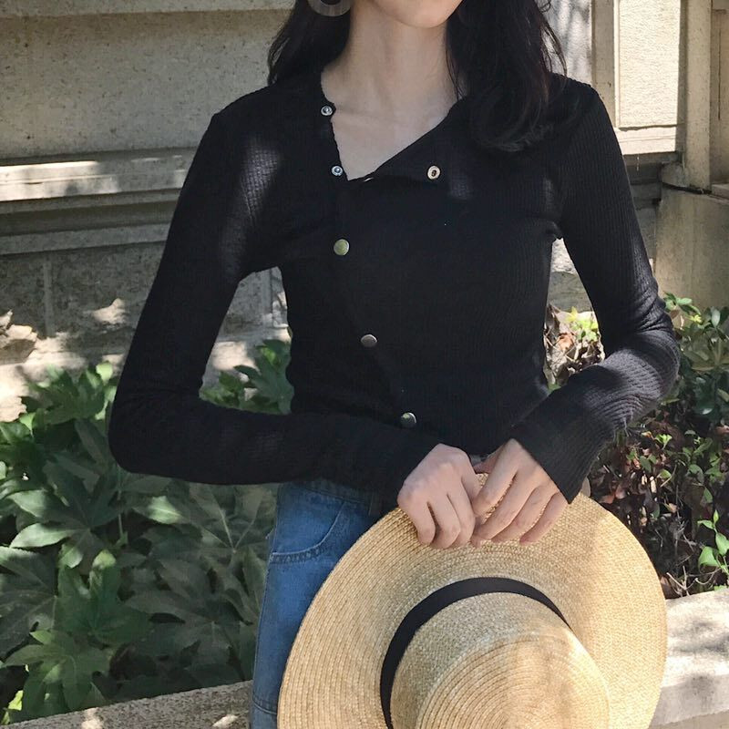 港味復古chic風斜扣螺紋針織新款韓版修身顯瘦純色長袖襯衫上衣女
