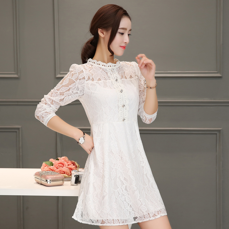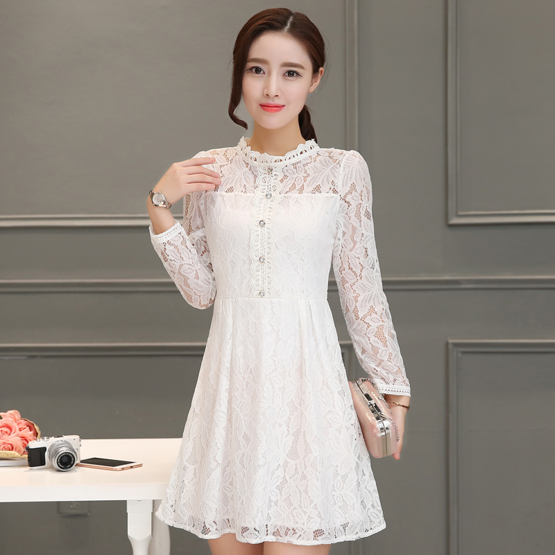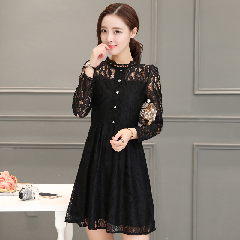 / 春季新款時尚韓版長袖中長款蕾絲連衣裙女修身淑女打底裙子潮