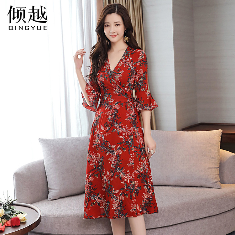 傾越春款連衣裙2017新款女夏季韓版七分袖V領中長雪紡印花A型裙子