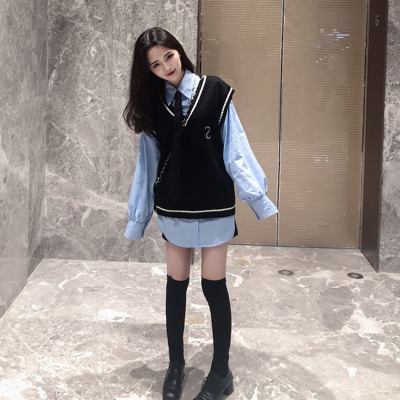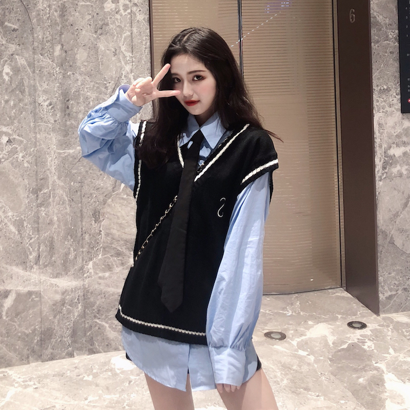 秋冬新款復古V領字母刺繡毛衣馬甲燈籠袖格子襯衫領帶時尚套裝女