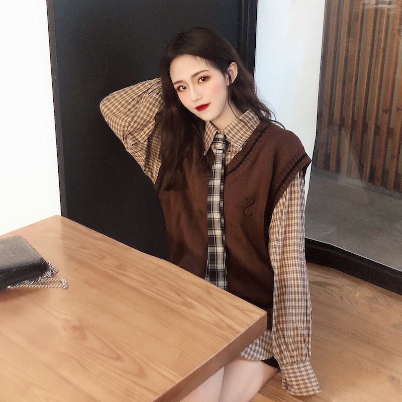 / 秋冬新款復古V領字母刺繡毛衣馬甲燈籠袖格子襯衫領帶時尚套裝女