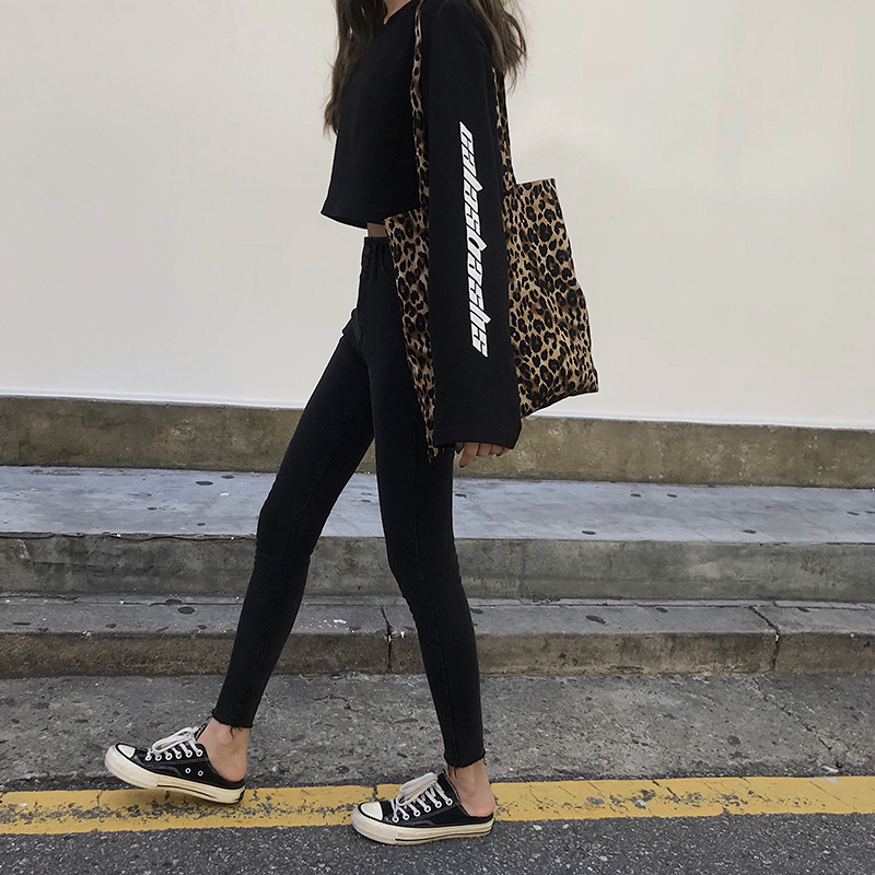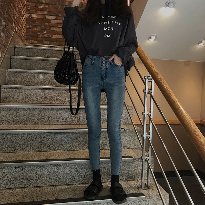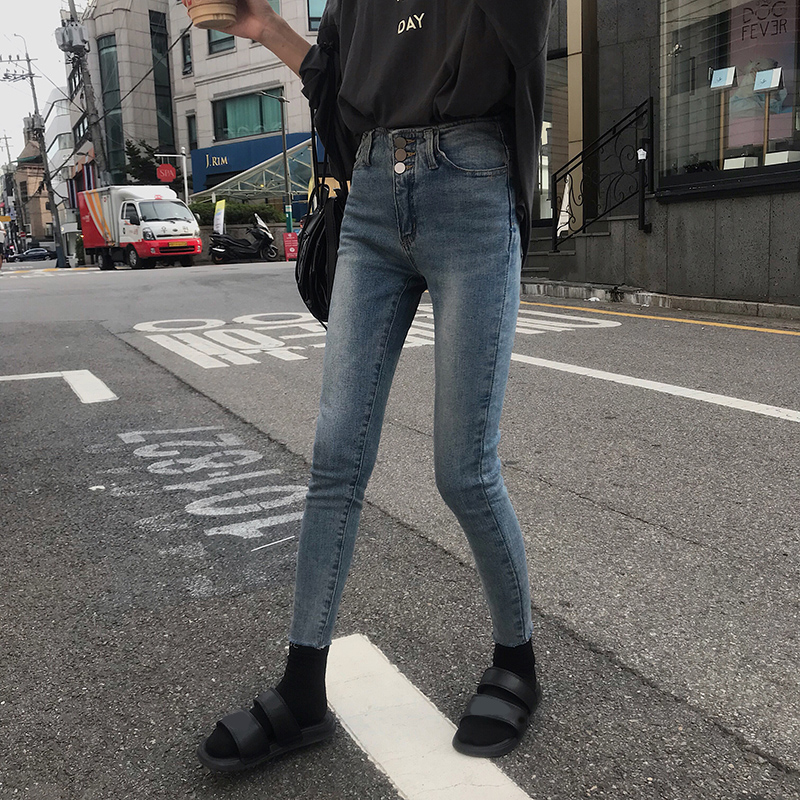 褲子2018秋裝新款韓版小清新水洗單排扣高腰毛邊九分牛仔鉛筆褲女