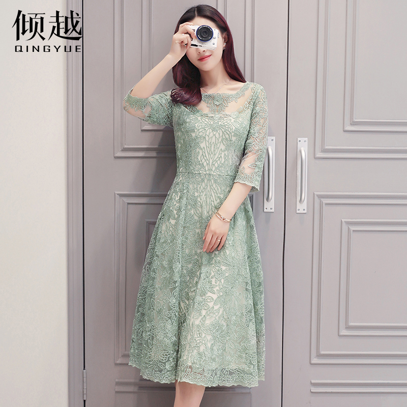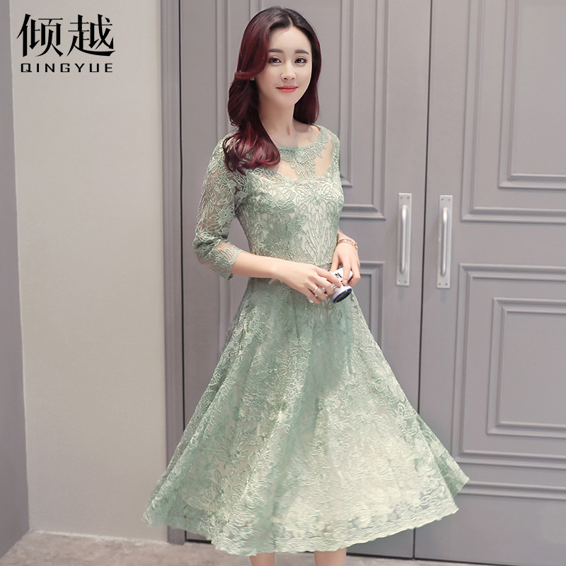 / 傾越2017春季新款韓版鏤空蕾絲裙修身中長款A字七分袖套頭連衣裙