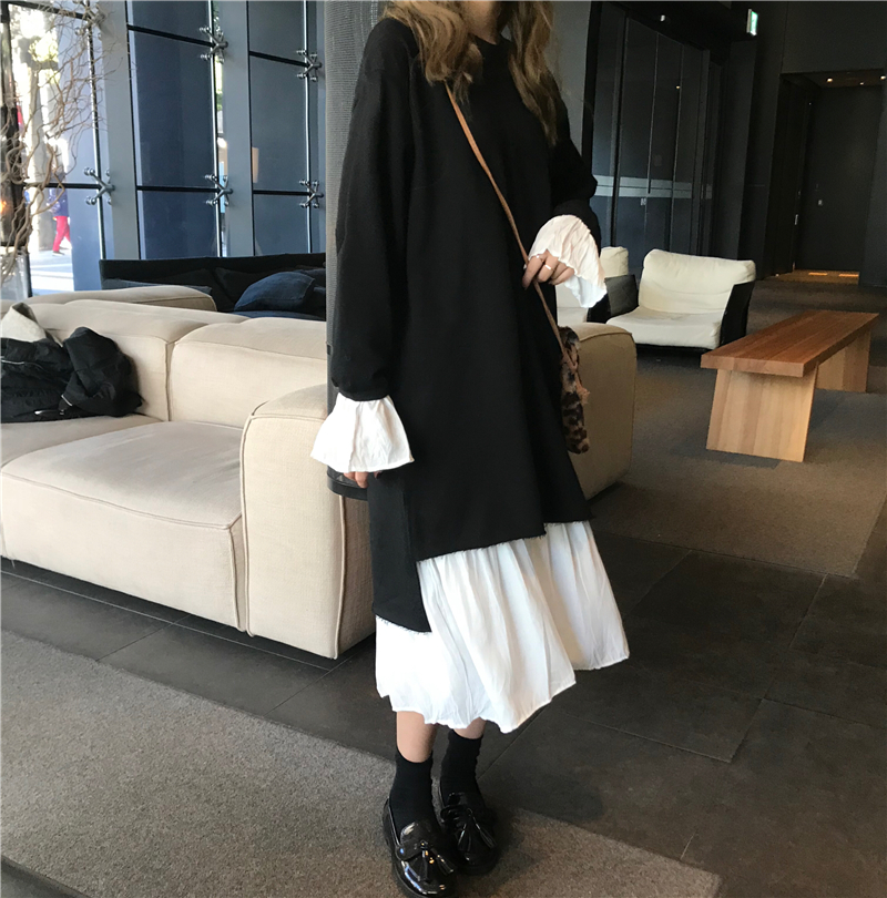 / 新款內搭吊帶打底裙時尚套裝不規則拼接喇叭袖連衣裙chic兩件套女
