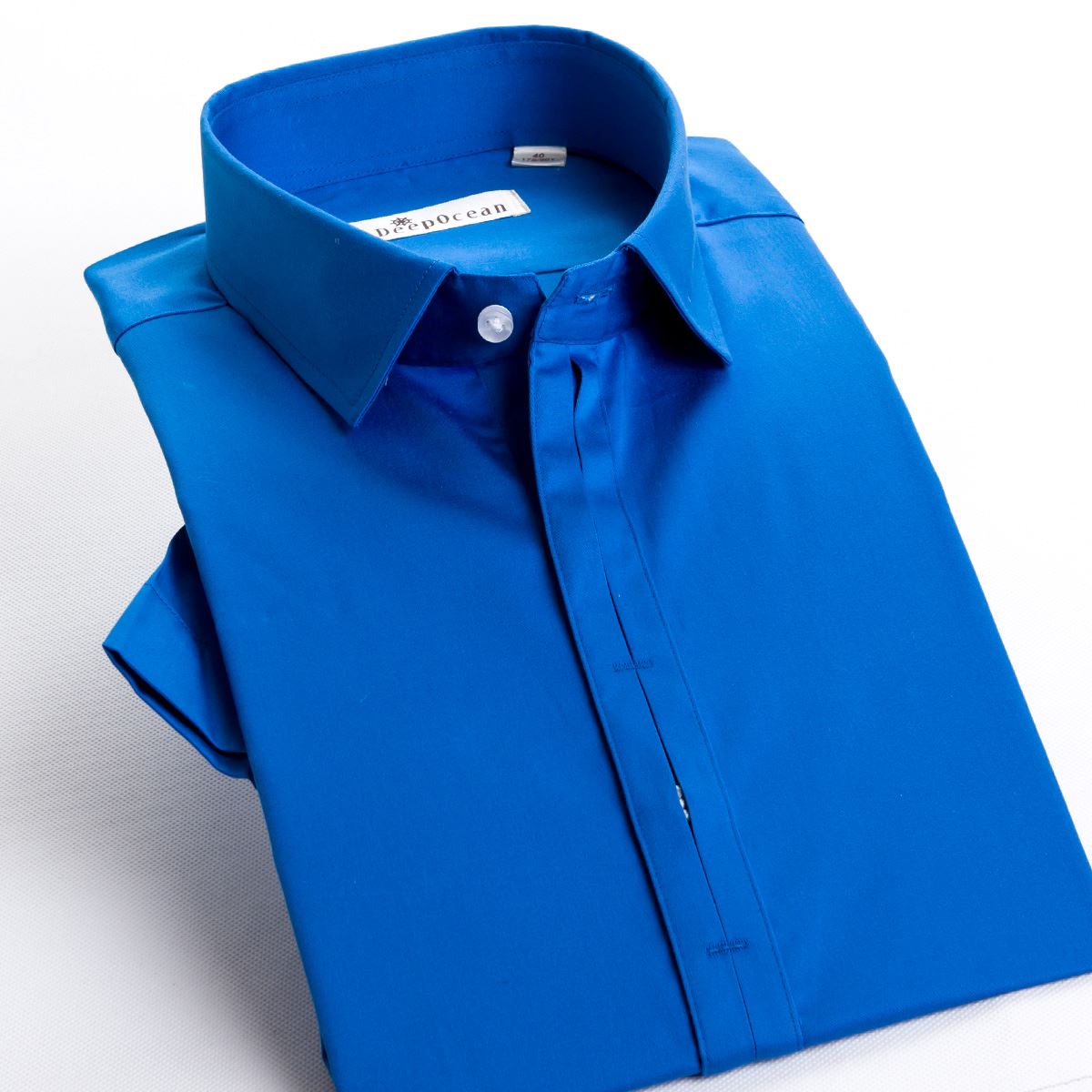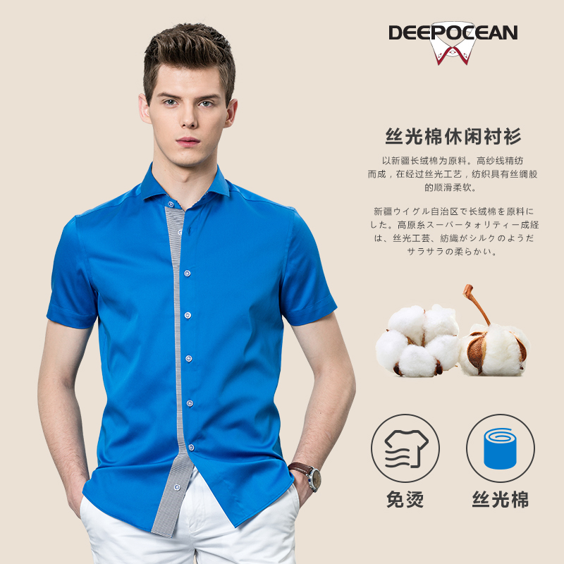 / 夏季新款男士短袖襯衫純藍色時尚拼接小領寸衫新品薄款男裝襯衣