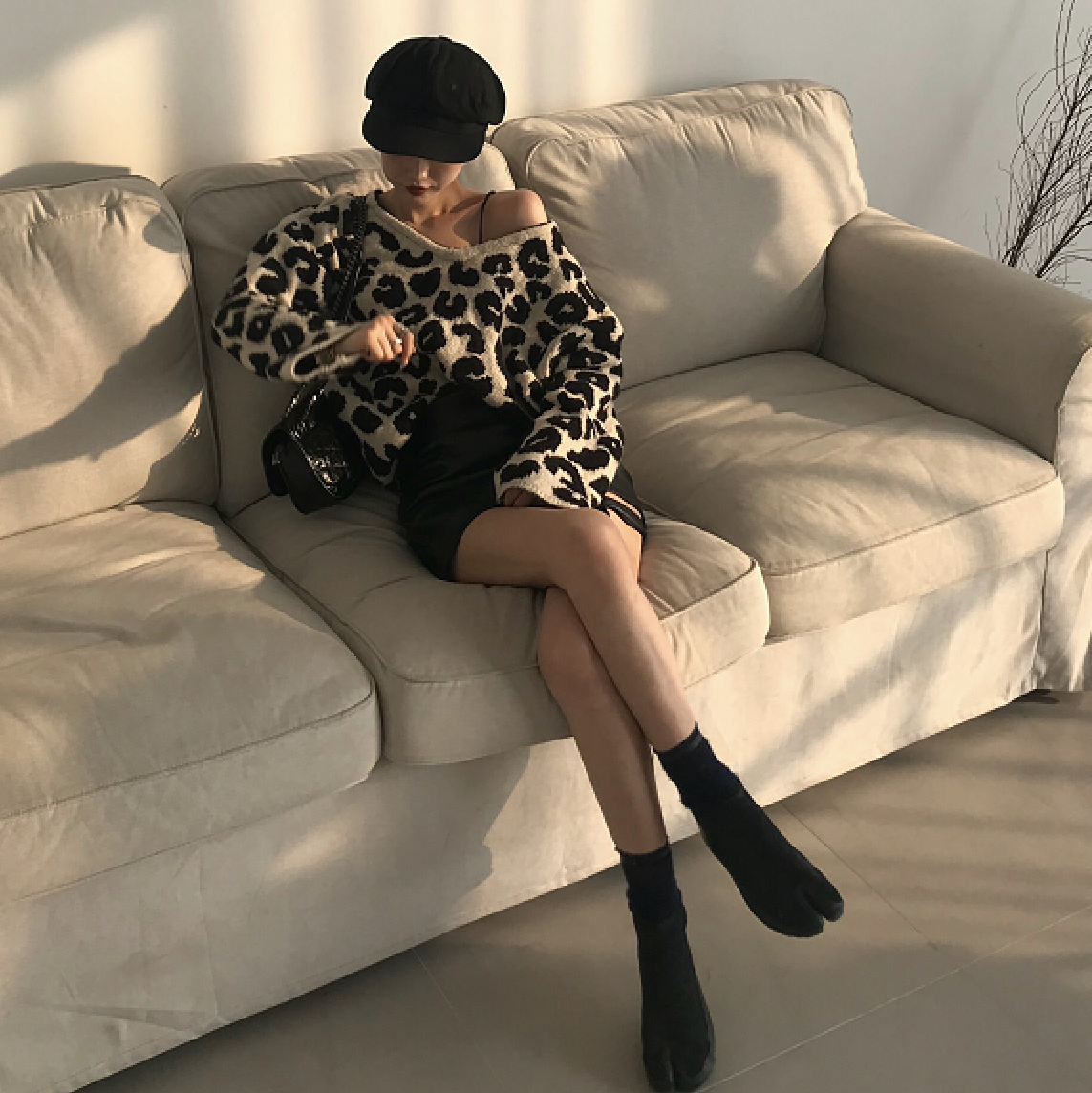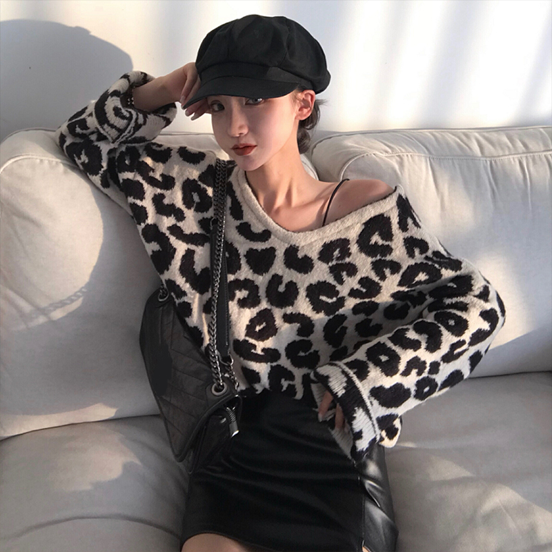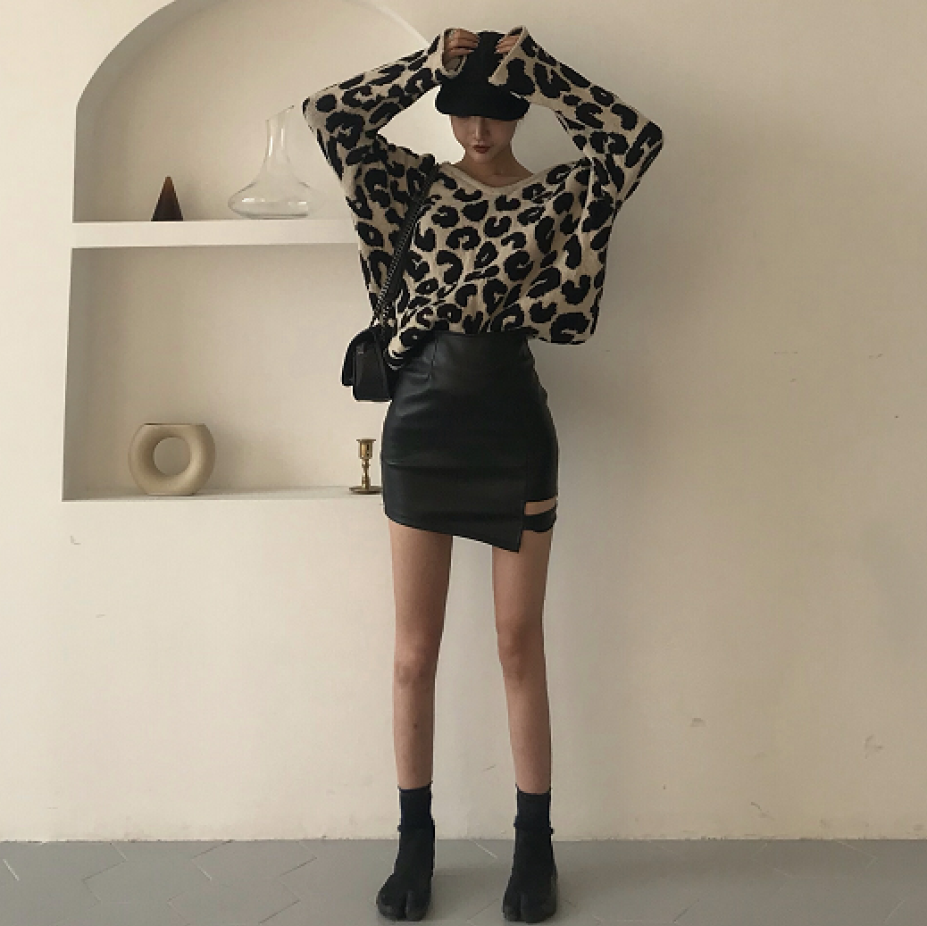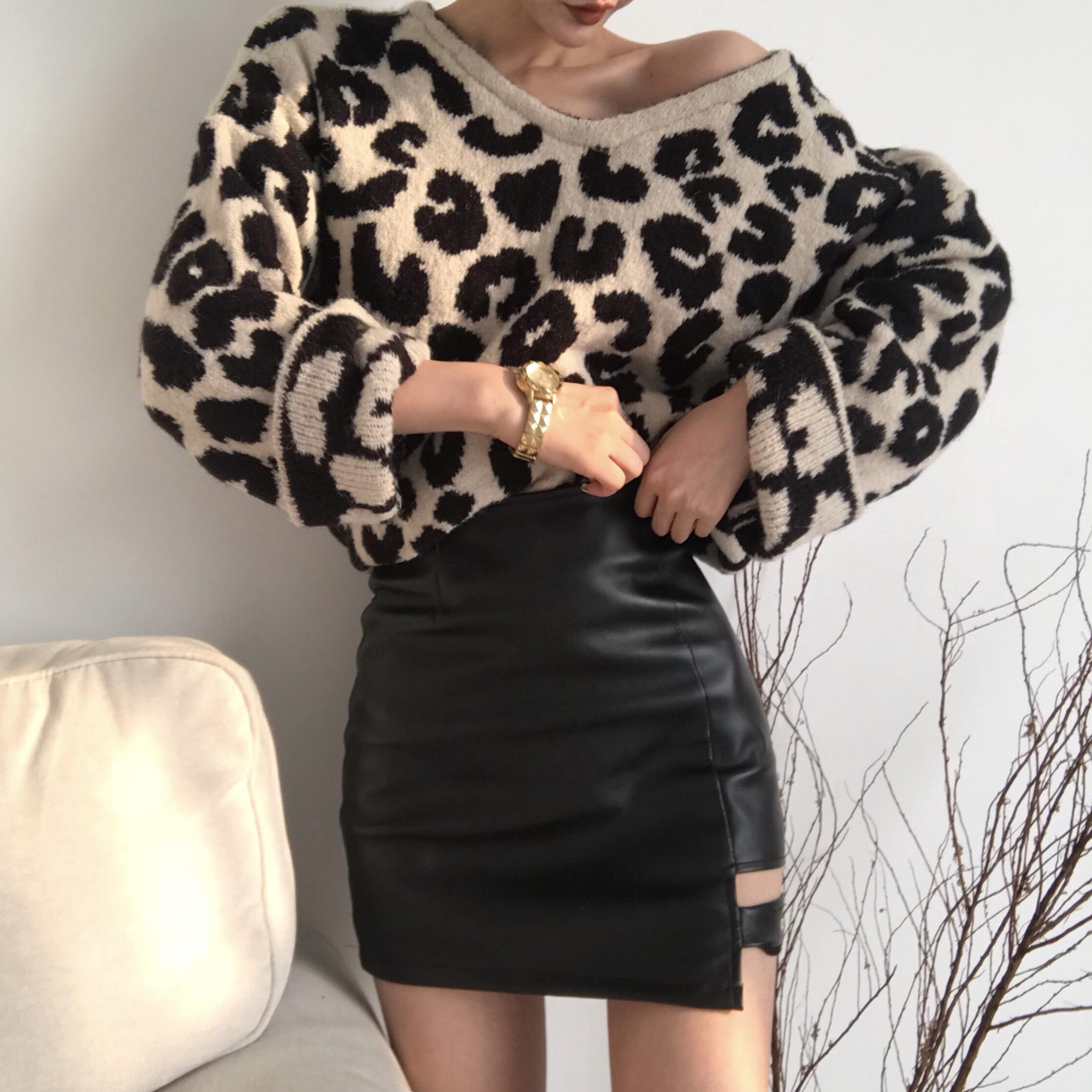/ 2018秋裝百搭豹紋V領寬松毛衣針織上衣PU皮鏤空高腰半身裙套裝女