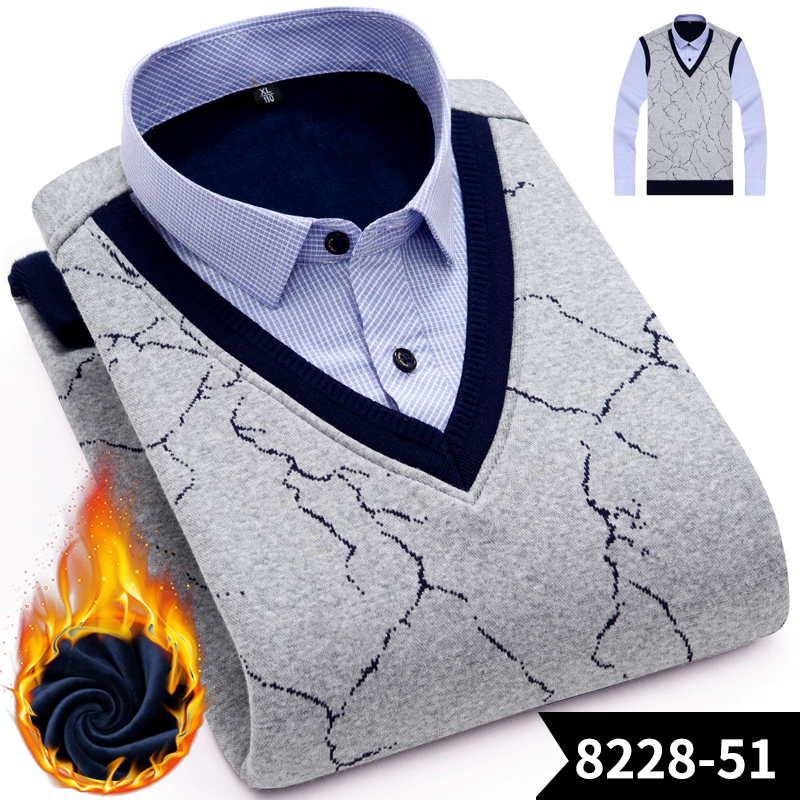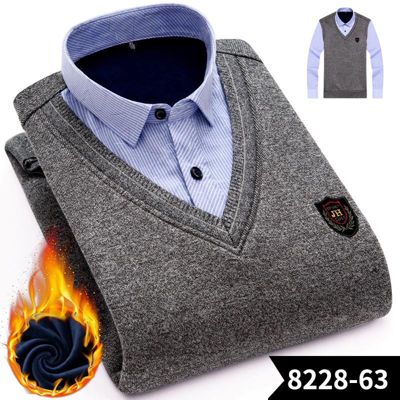 / 冬季假兩件保暖襯衫男加絨加厚休閑中年爸爸保暖襯衣套頭保暖上衣