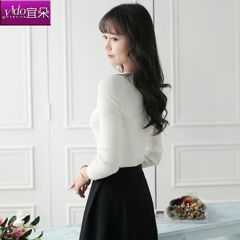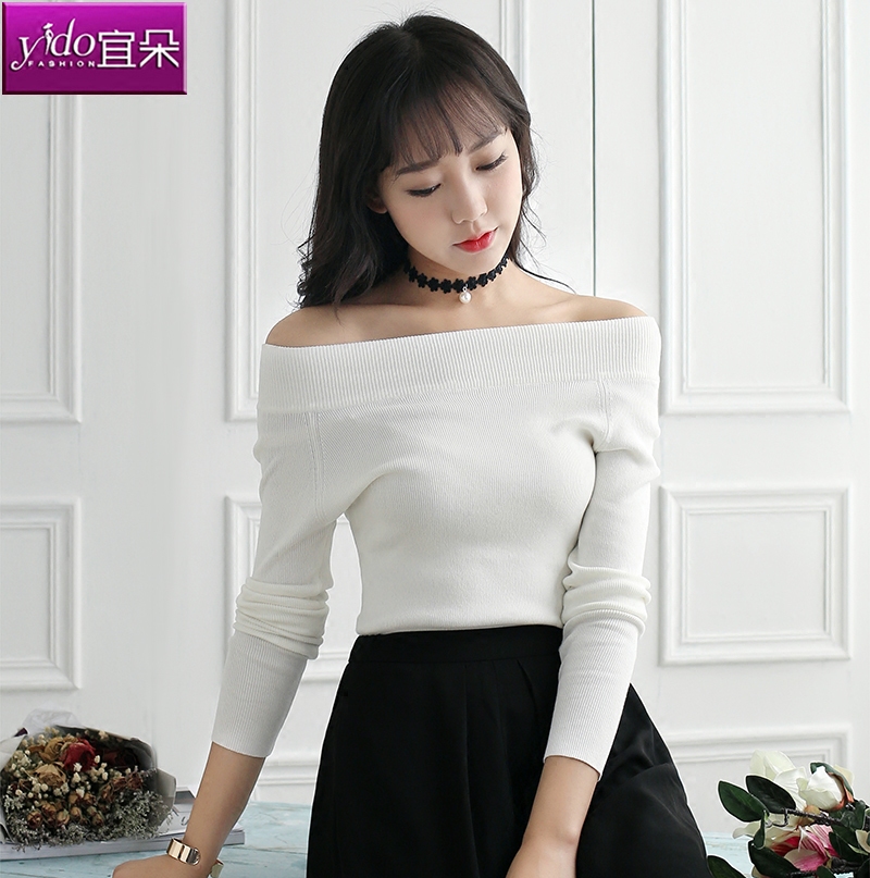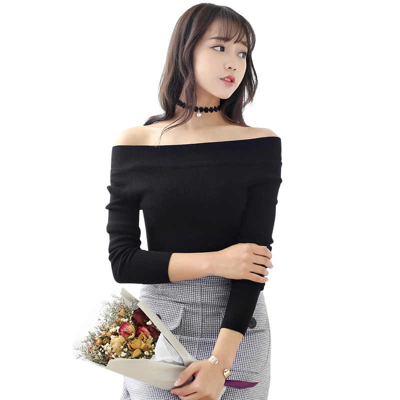 / 一字領露肩針織打底衫女短款長袖春季顯瘦針織衫女套頭毛衣女修身