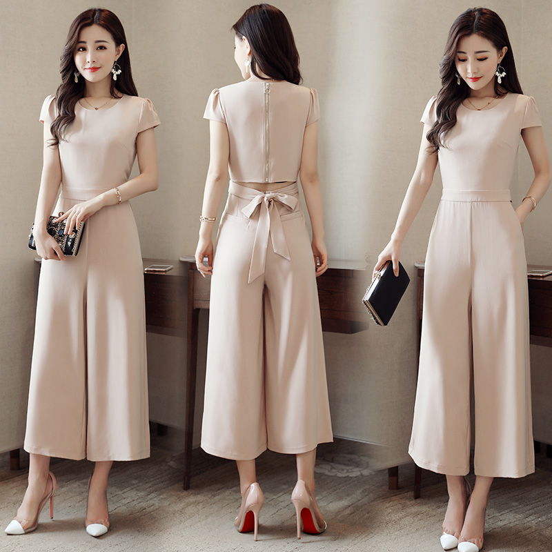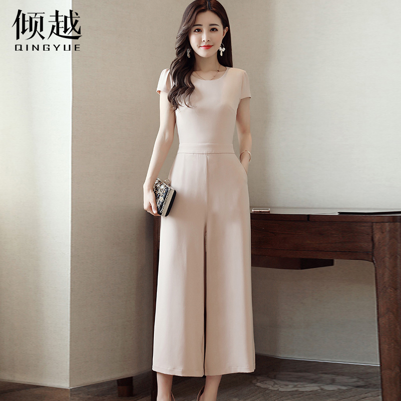 / 連體褲女夏韓版氣質修身顯瘦闊腿褲圓領短袖純色連衣褲2017新款潮