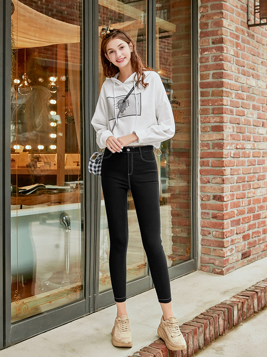 MG小象黑色緊身小腳褲女秋冬時尚高腰休閑鉛筆褲外穿打底九分褲子