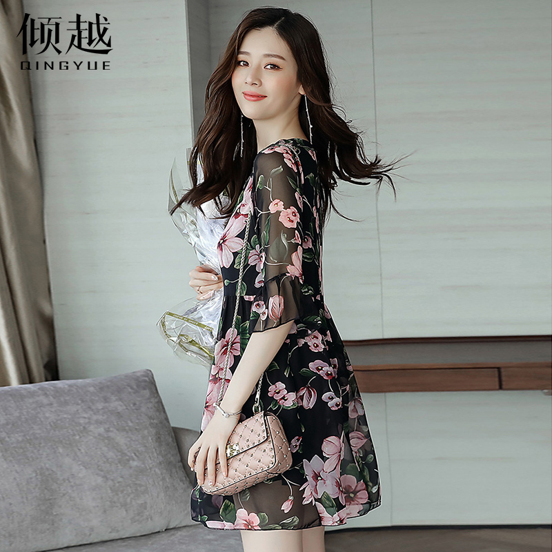 / 2017夏裝新款女裝時尚韓版寬松裙子圓領荷葉袖印花雪紡連衣裙女潮