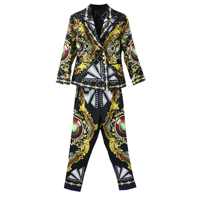 歐美范印花西裝套裝2018長袖小西服修身七分褲職業套裝網紅兩件套