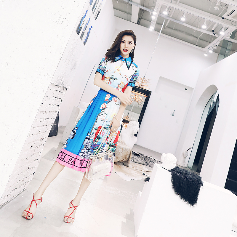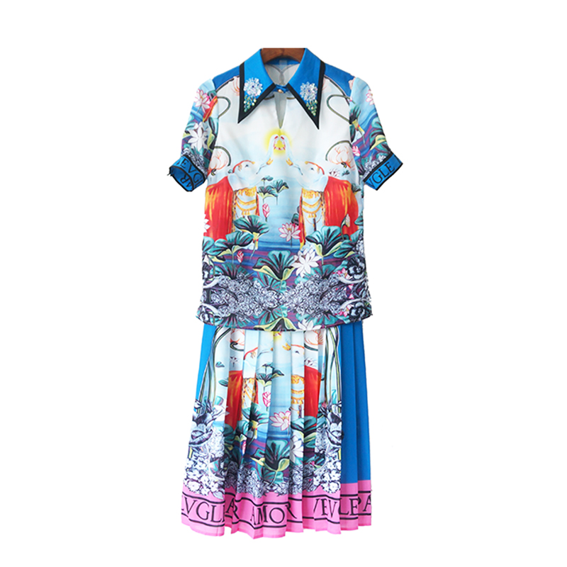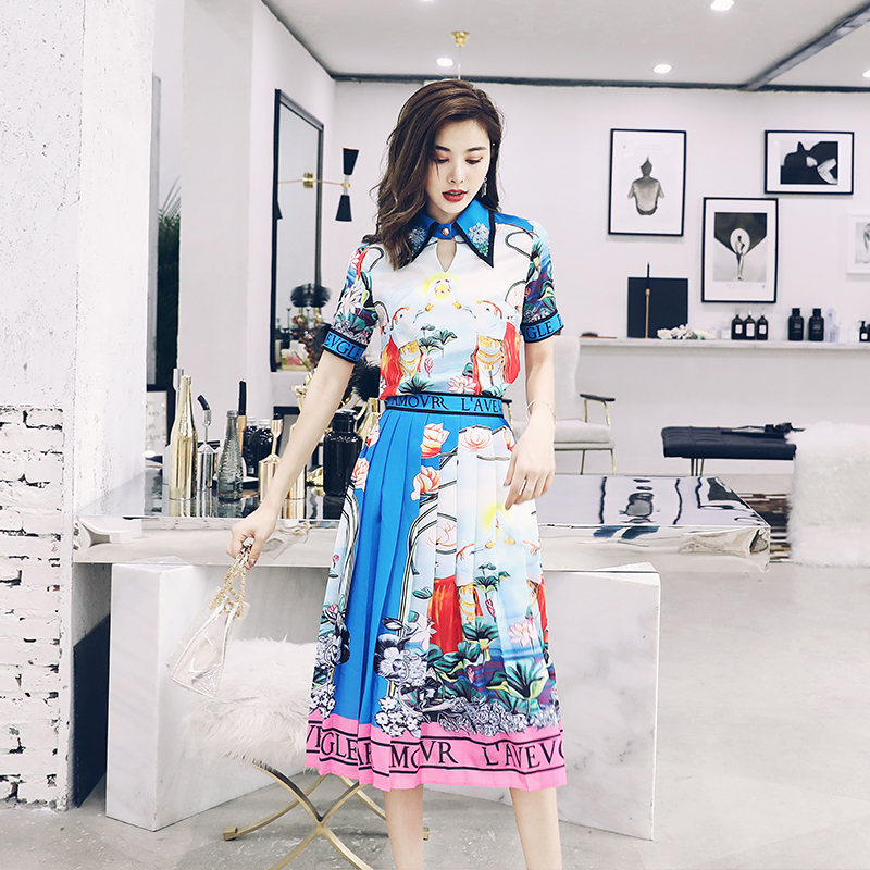 S秀名媛氣質2018夏季新品女神范顯瘦百褶半身裙拼色印花兩件套裝