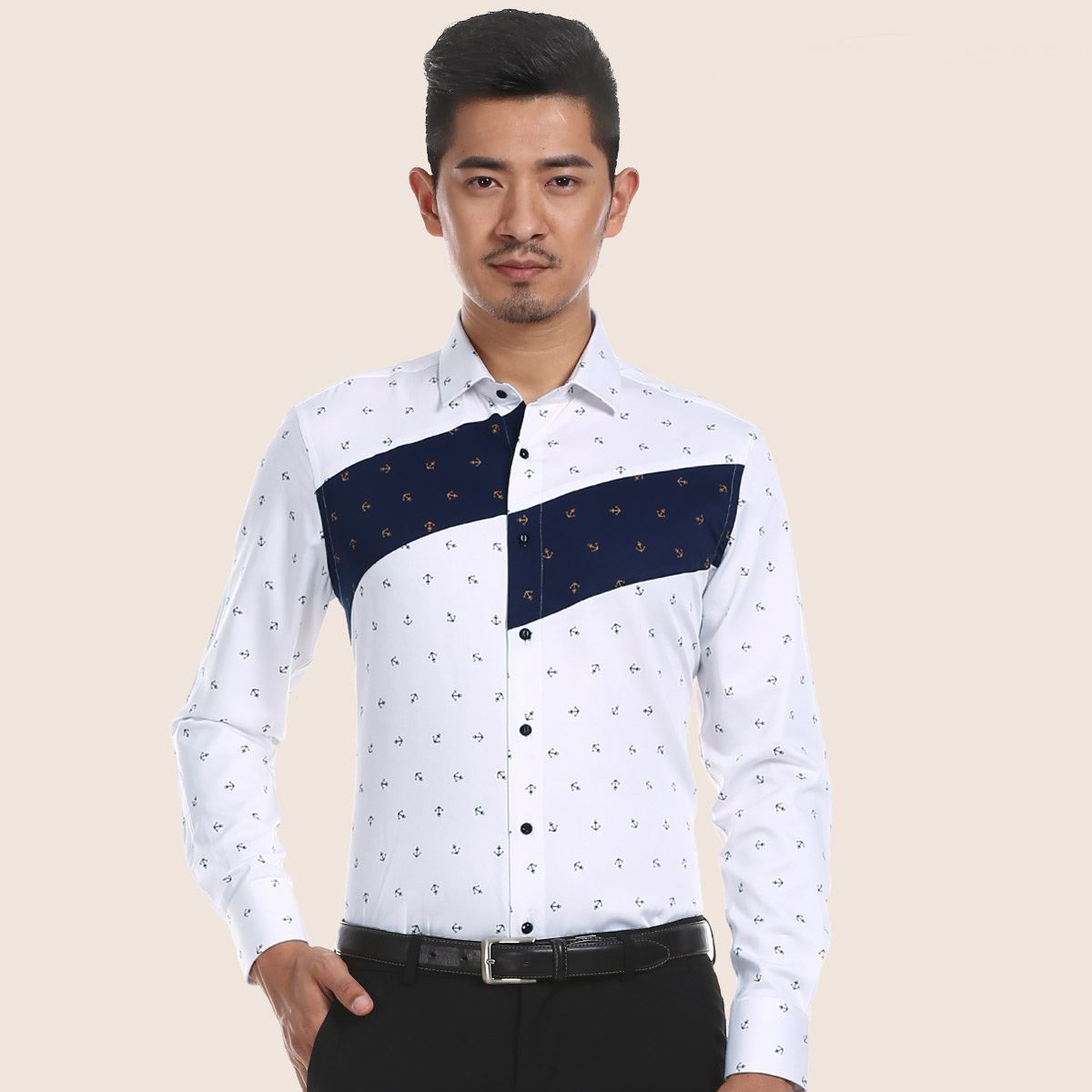 / 深海男士個性長袖襯衫時尚斜裁拼接印花休閑絲光棉純棉英襯衣秋款