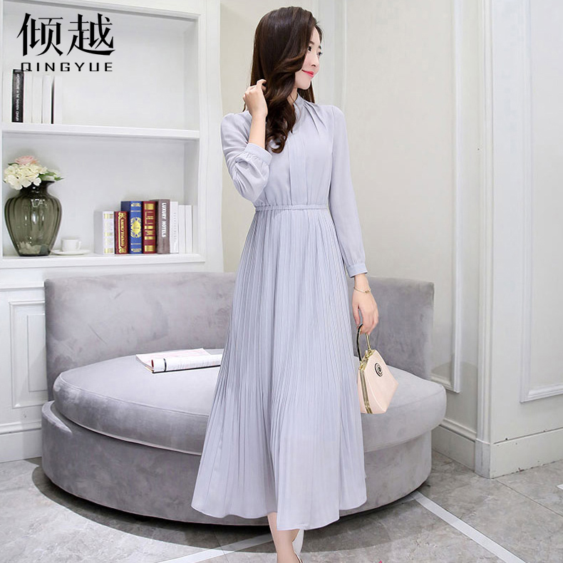 / 傾越雪紡連衣裙女中長款2017新款春夏百搭v領氣質長袖修身百褶裙
