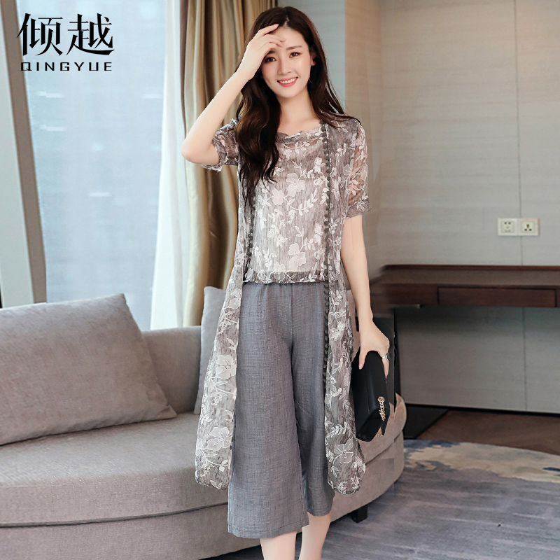 傾越2017碎花七分闊腿褲夏季新款時尚百搭修身氣質短袖背心三件套