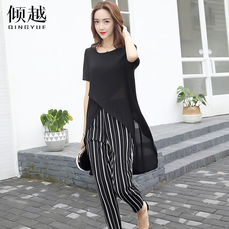 傾越2017新款夏季女裝復古歐洲站套裝時尚韓版條紋九分褲兩件套潮