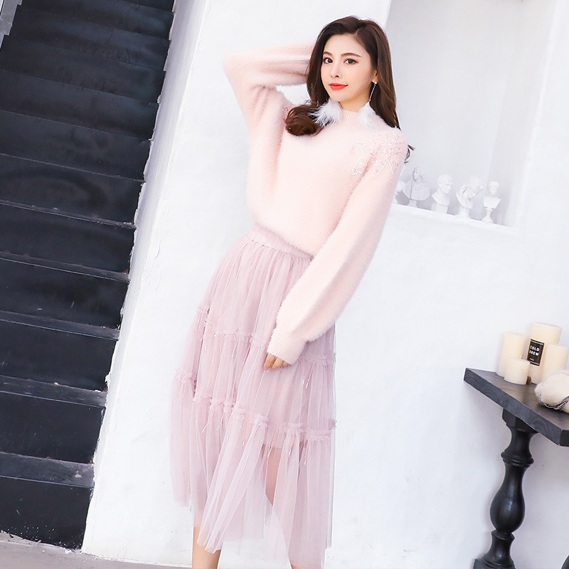 秋冬款套裝女2018新款針織上衣網紗半身裙兩件套淑女氣質中長款