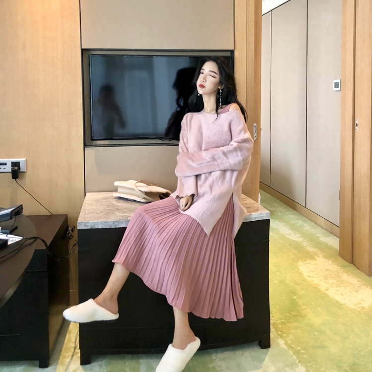 2018秋冬新款韓版晚晚風時尚兩件套加厚上衣背心壓褶連衣裙套裝女