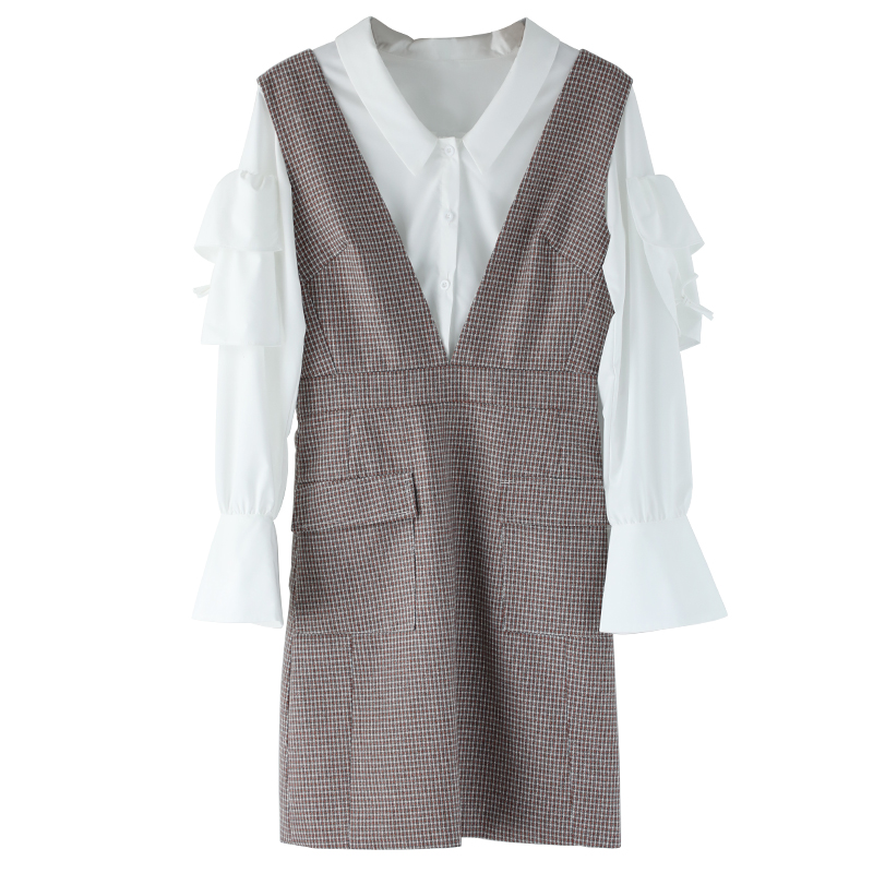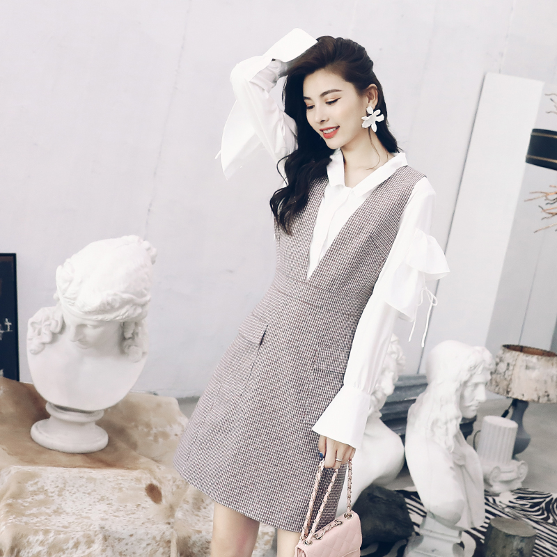 / 名媛復古背帶連衣裙女2018秋新品長袖上衣打底衫中長款裙子套裝