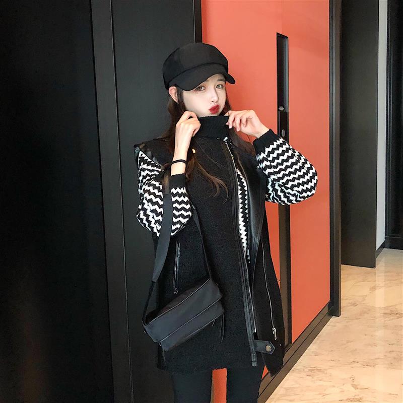 / 新款拼接中長款皮毛一體馬夾慵懶長袖條紋拼色毛衣時尚套裝兩件套