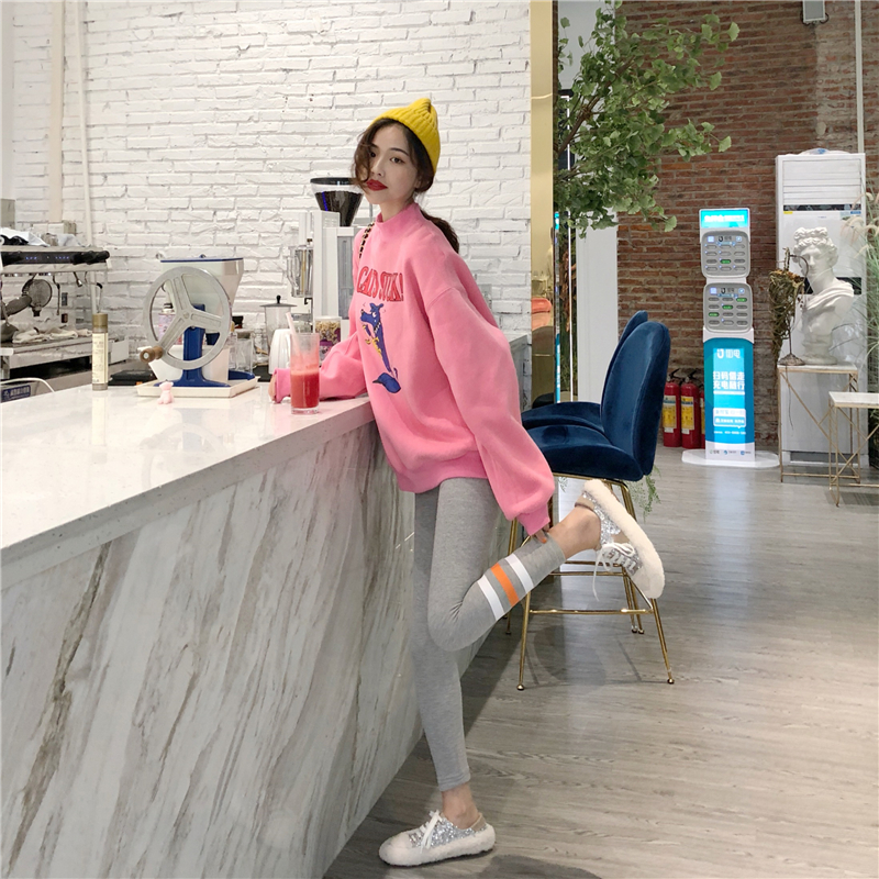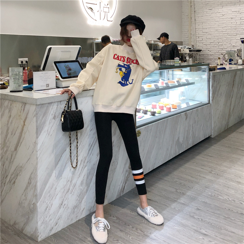 / 慵懶卡通中領加絨衛衣時尚套裝高腰顯瘦絨彈力條紋小腳褲兩件套女