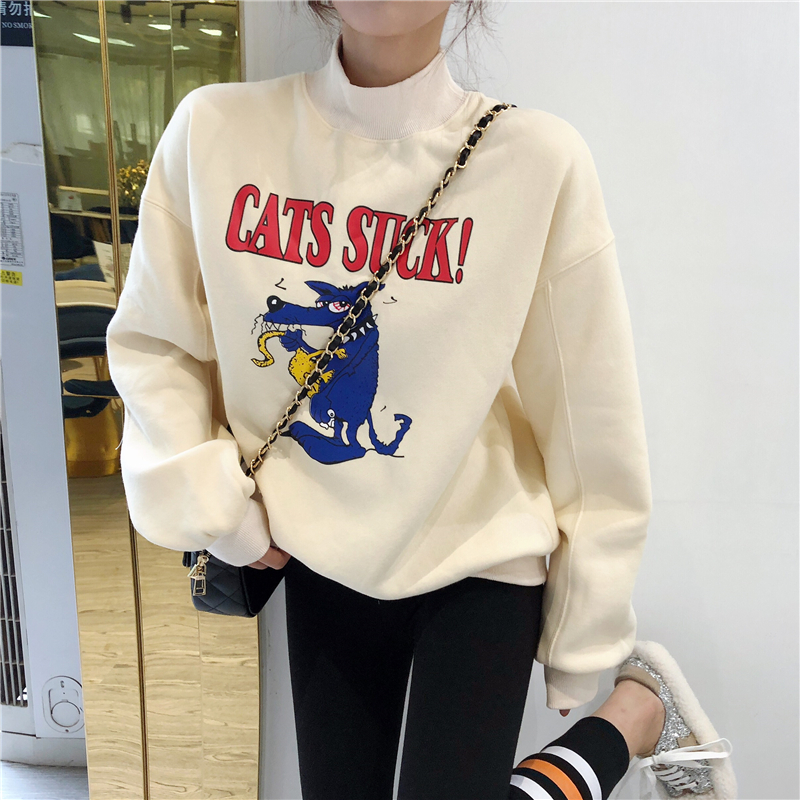 慵懶卡通中領加絨衛衣時尚套裝高腰顯瘦絨彈力條紋小腳褲兩件套女