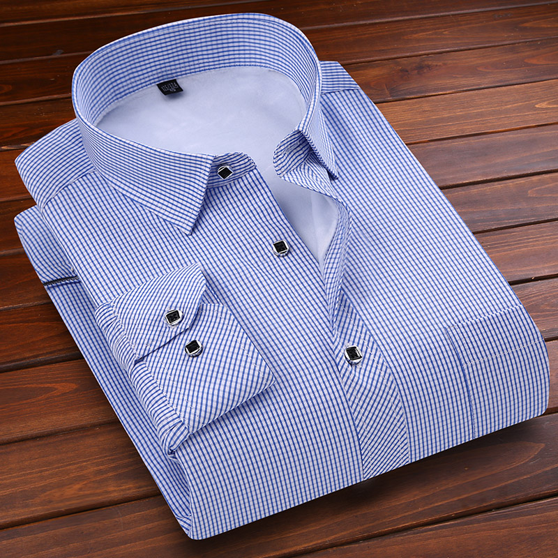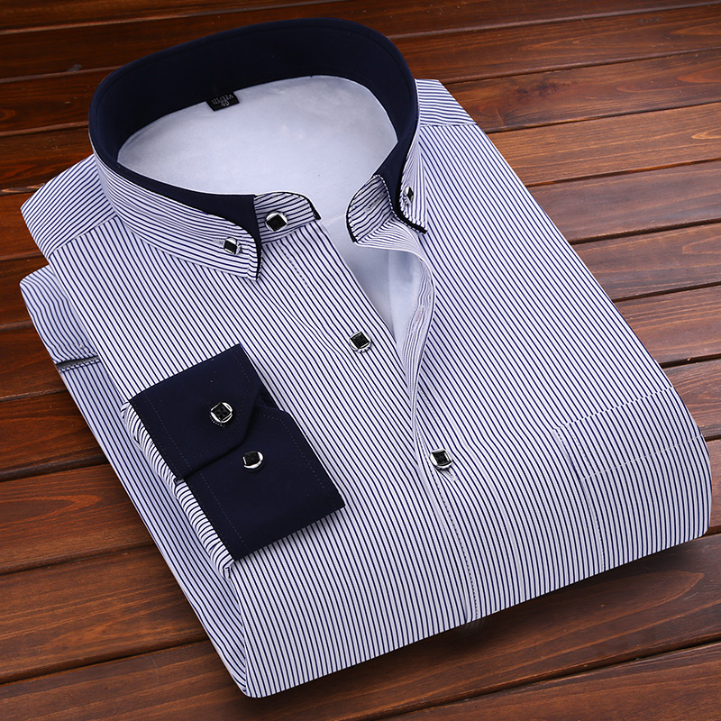 / 冬季長袖加絨加厚男士保暖襯衫中年藏藍條紋保暖襯衣男爸爸裝大碼