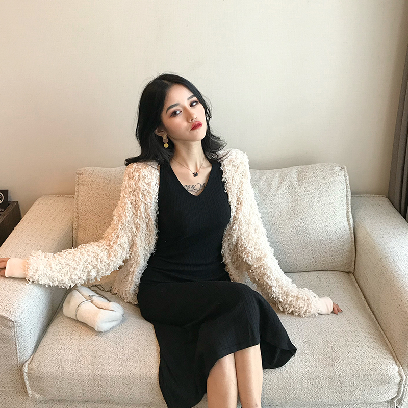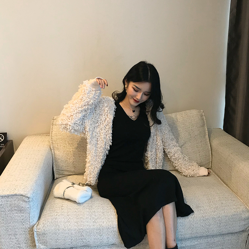 2018秋冬新款韓版時尚套裝毛毛開衫外套V領吊帶連衣裙chic兩件套
