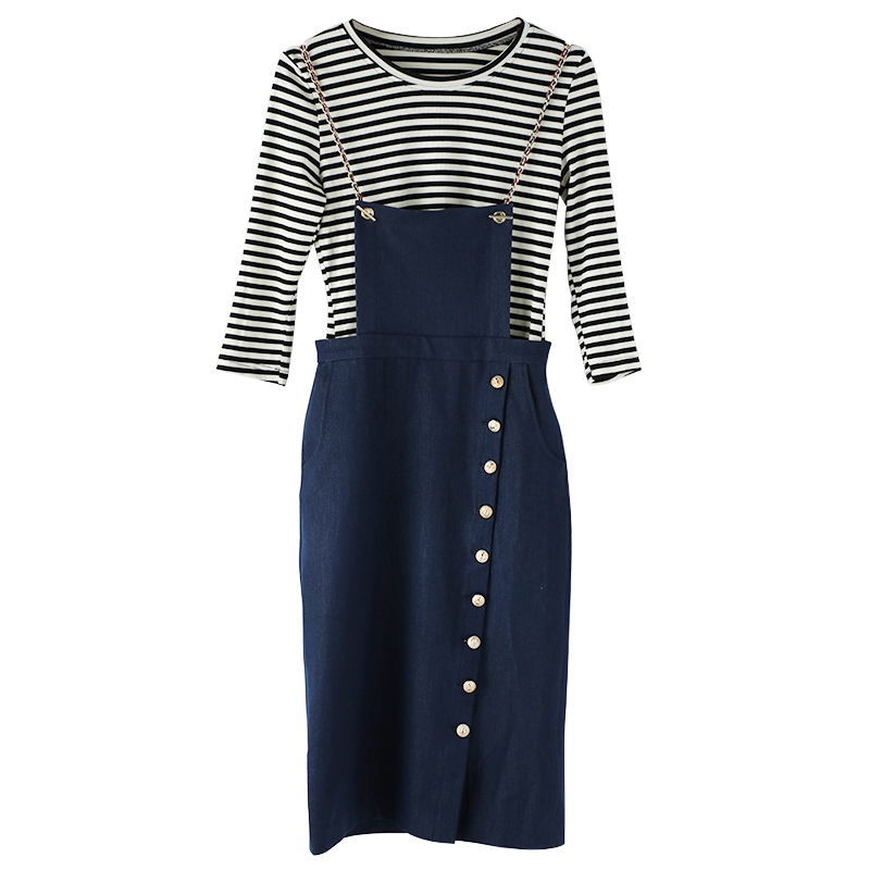 / 2018韓版休閑時尚秋季新款女裝條紋針織上衣牛仔吊帶連衣裙套裝