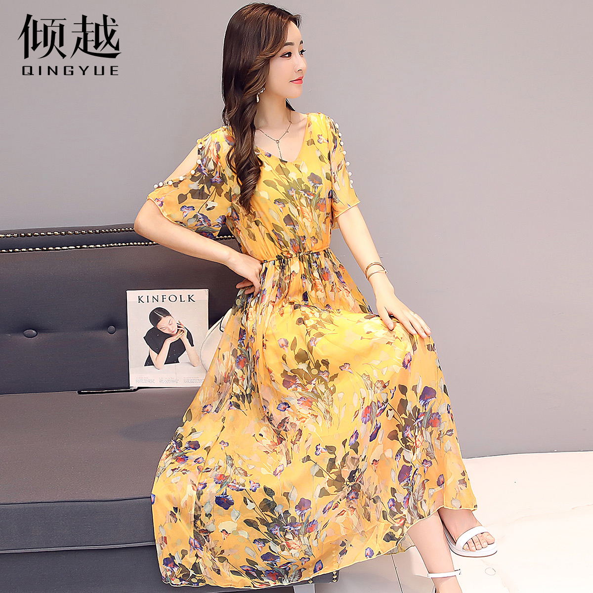/ 夏季淑女V領碎花雪紡連衣裙女式松緊腰顯瘦長裙子釘珠短袖大擺裙