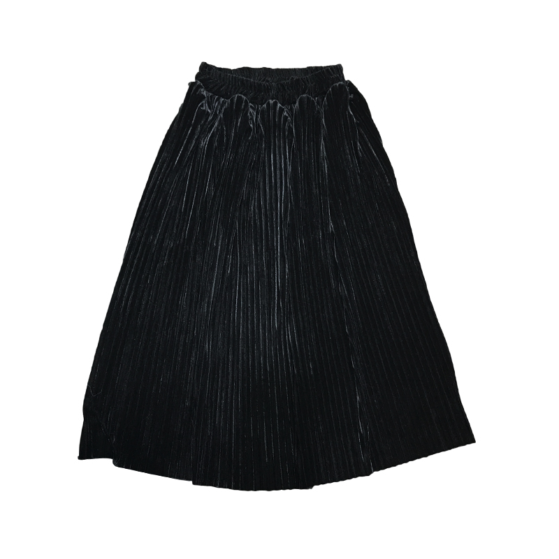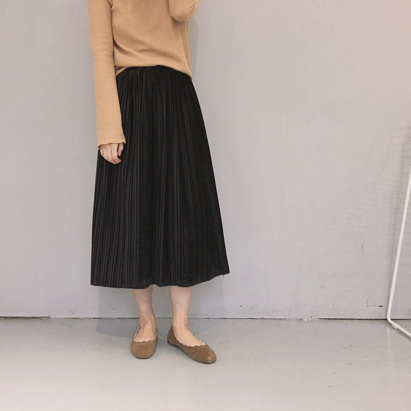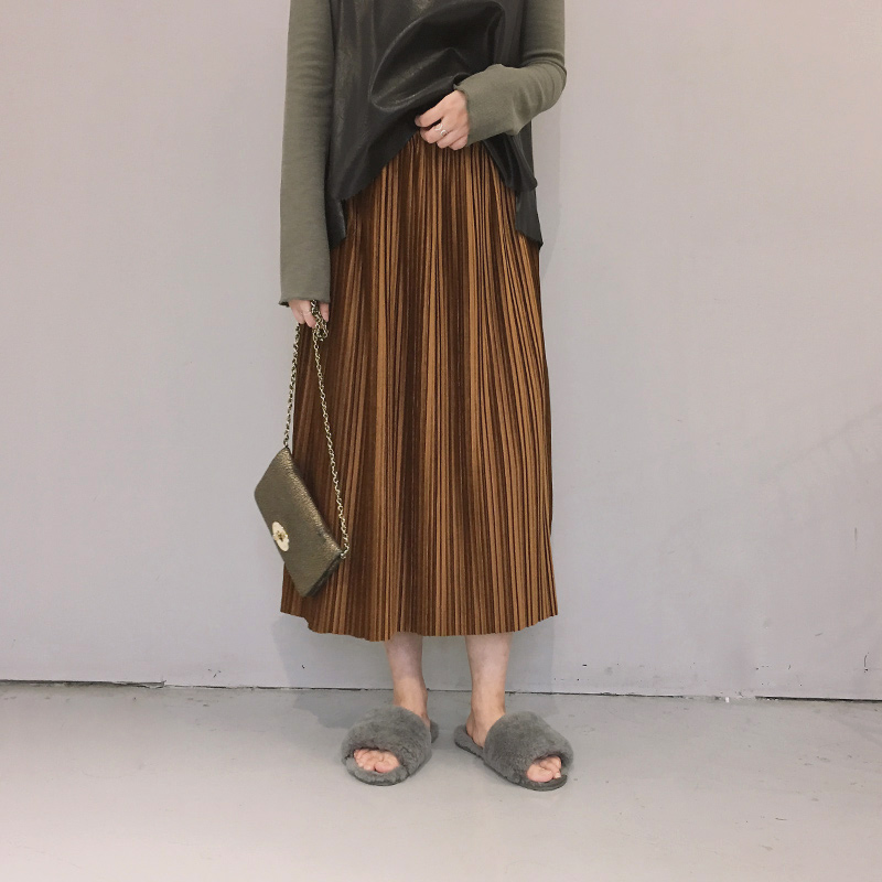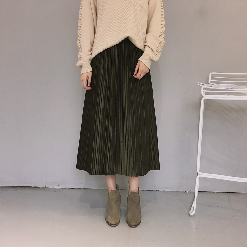 / 韓國秋冬松緊腰百褶絲絨壓皺厚實復古中長款氣質百搭半身裙女