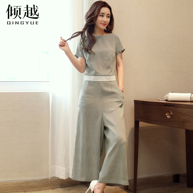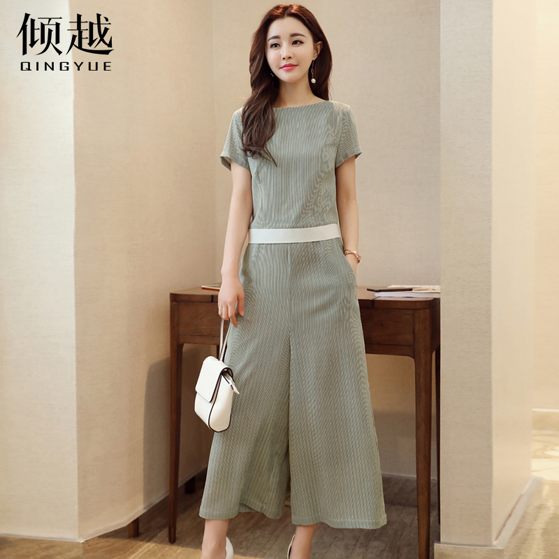 傾越2017夏季新款套裝純色氣質時尚圓領短袖寬松九分褲T恤兩件套