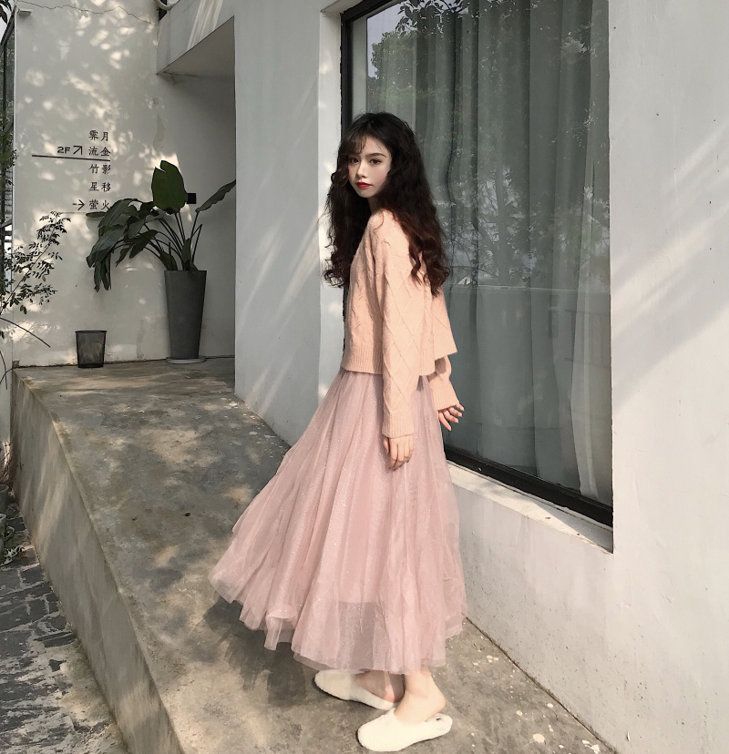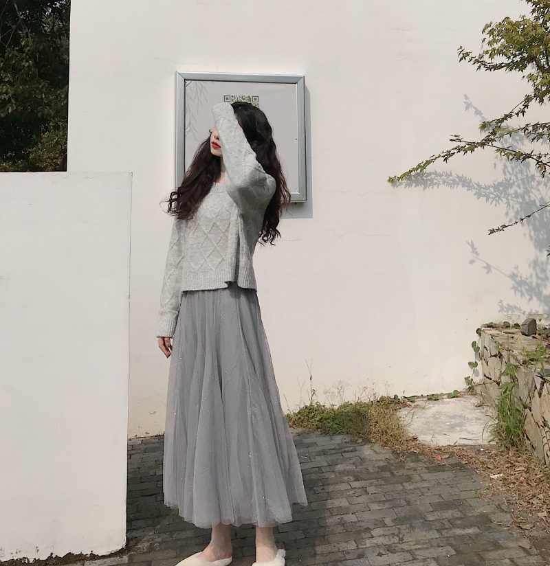 / 冬季新款寬松圓領套頭菱形針織毛衣高腰中長款星星網紗裙時尚套裝