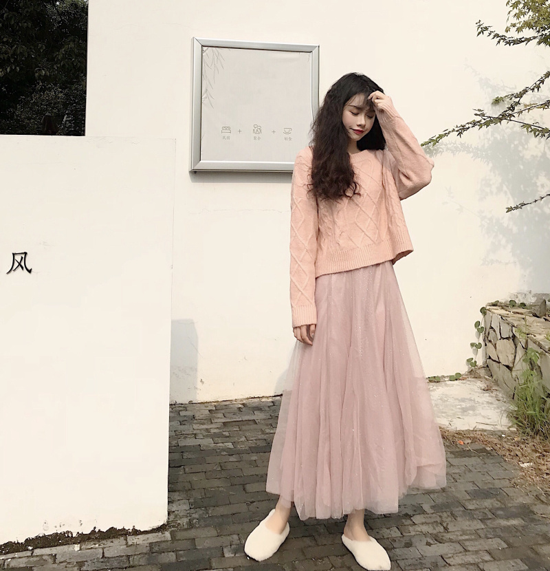 冬季新款寬松圓領套頭菱形針織毛衣高腰中長款星星網紗裙時尚套裝