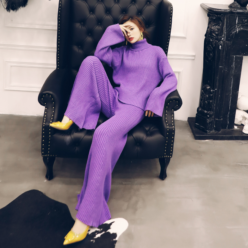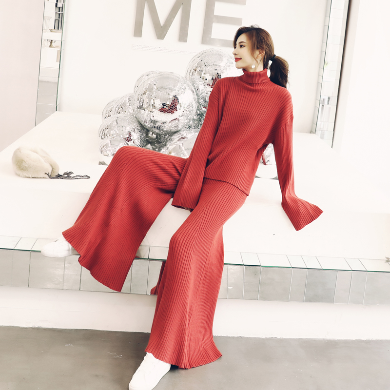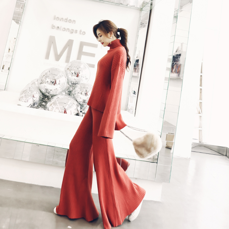 歐洲站針織兩件套闊腿褲喇叭長褲高腰顯瘦慵懶針織衫上衣毛衣套裝