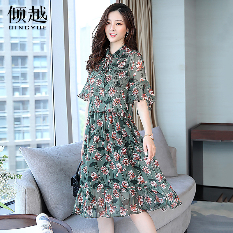 / 2017夏季新款淑女系帶套頭印花荷葉邊中長款雪紡連衣裙套裙兩件套