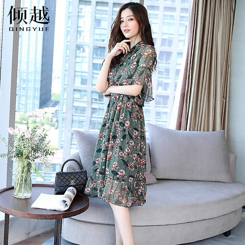 2017夏季新款淑女系帶套頭印花荷葉邊中長款雪紡連衣裙套裙兩件套