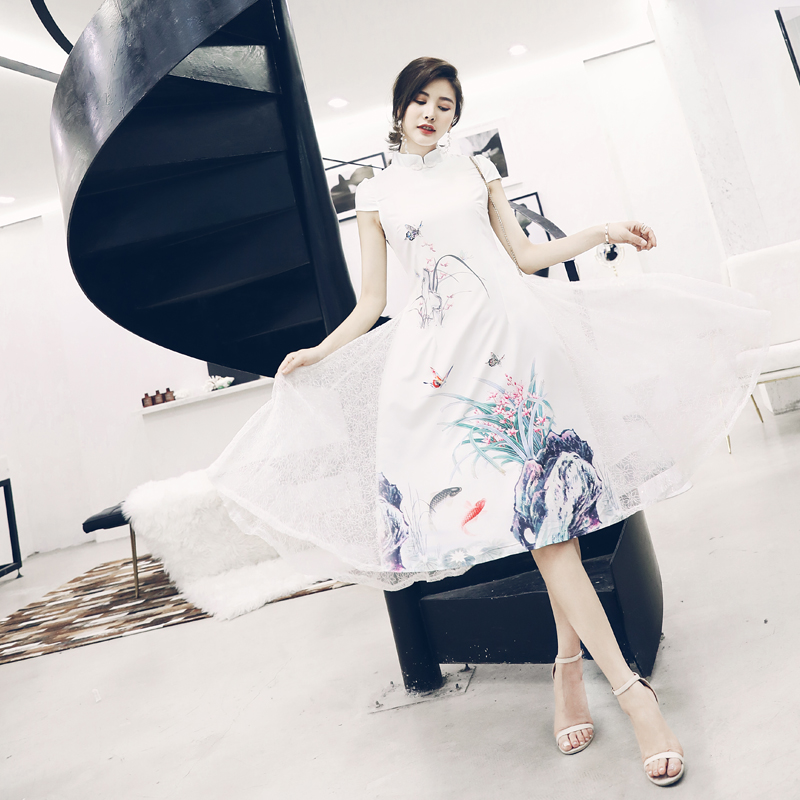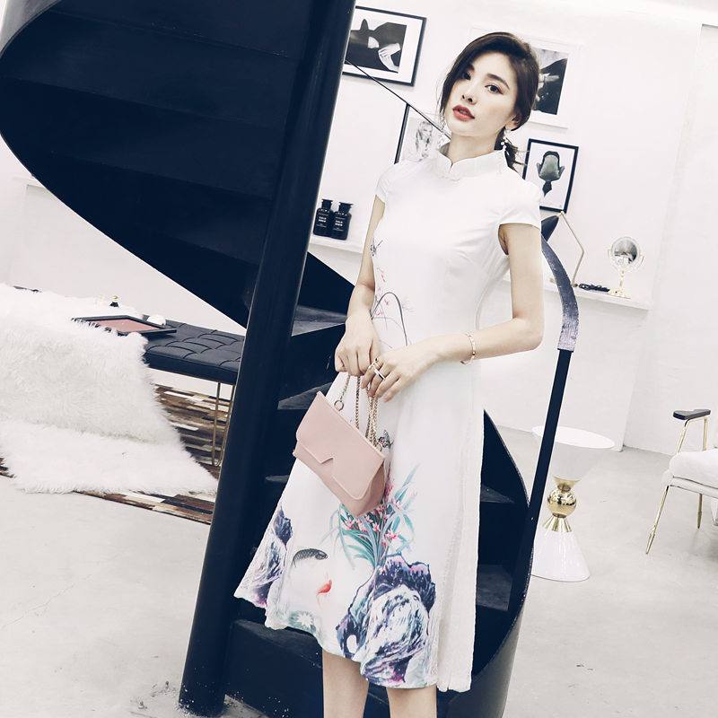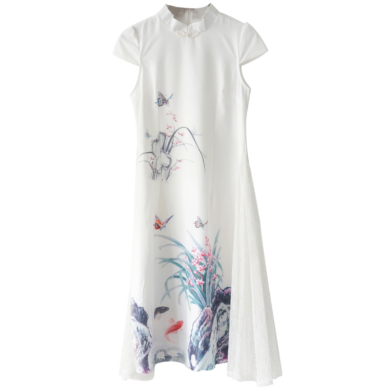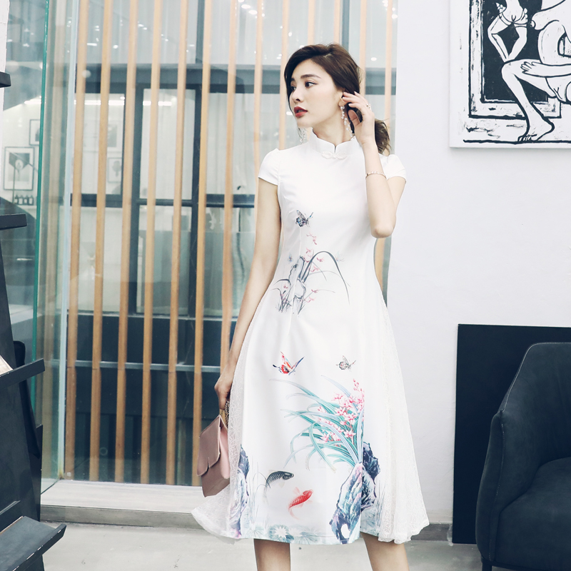 / s秀中國風改良旗袍女2018新品復古印花蕾絲拼接大擺裙連衣裙夏