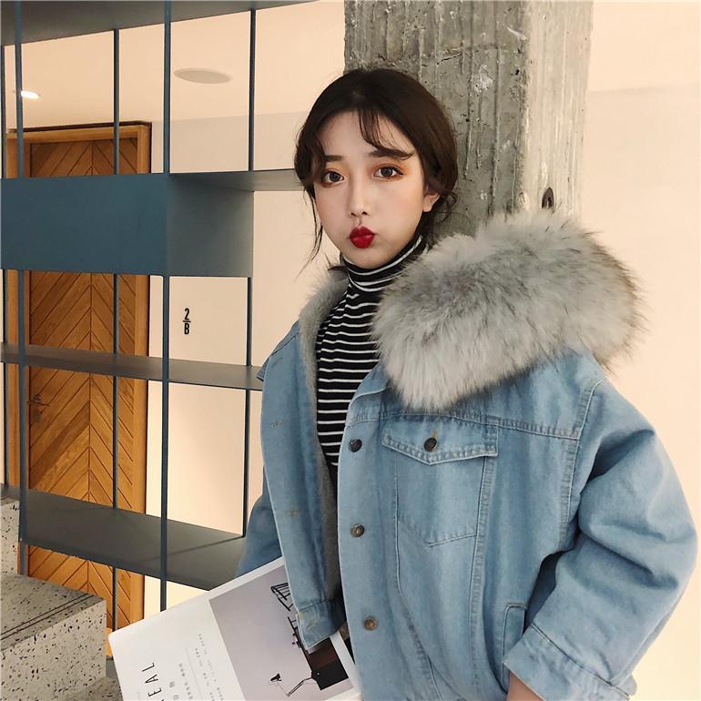 / 2018秋裝新款韓版時尚氣質百搭加絨牛仔連帽大毛領棉服保暖外套女