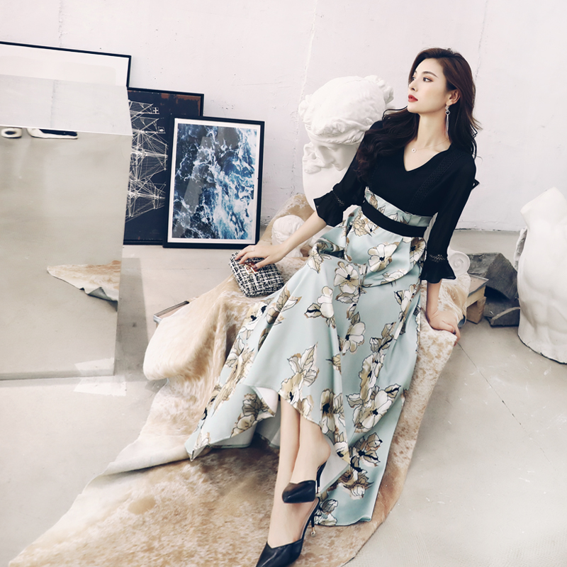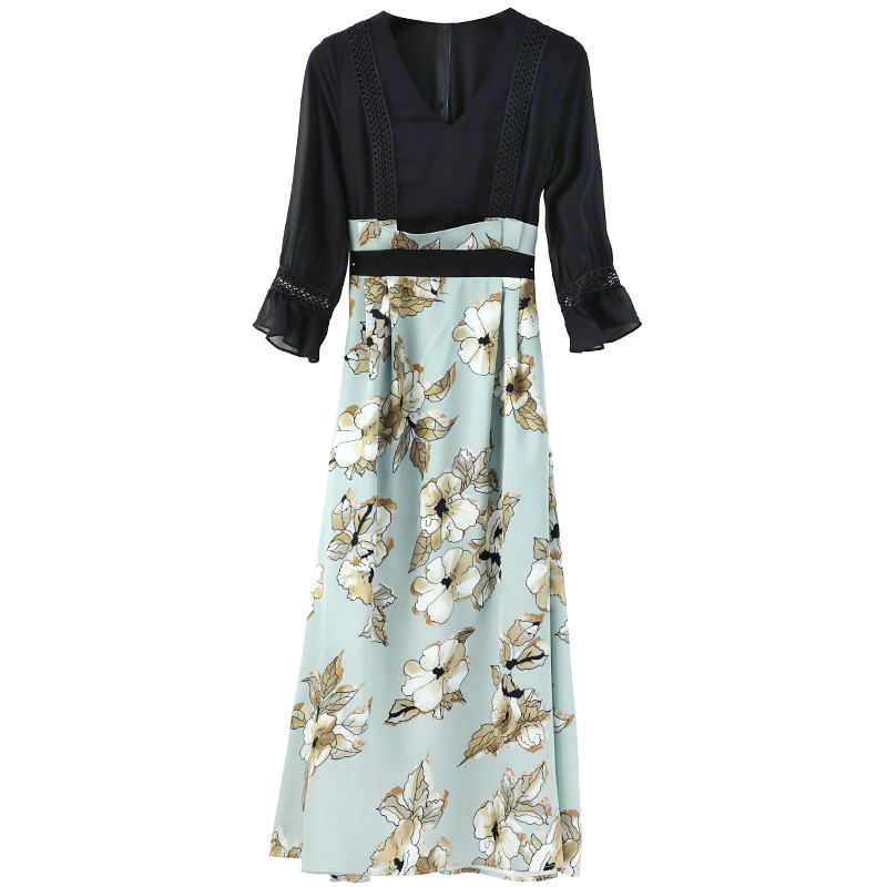 中袖拼接連衣裙女中長款2018秋季新款女裝時尚修身收腰chic早秋裙
